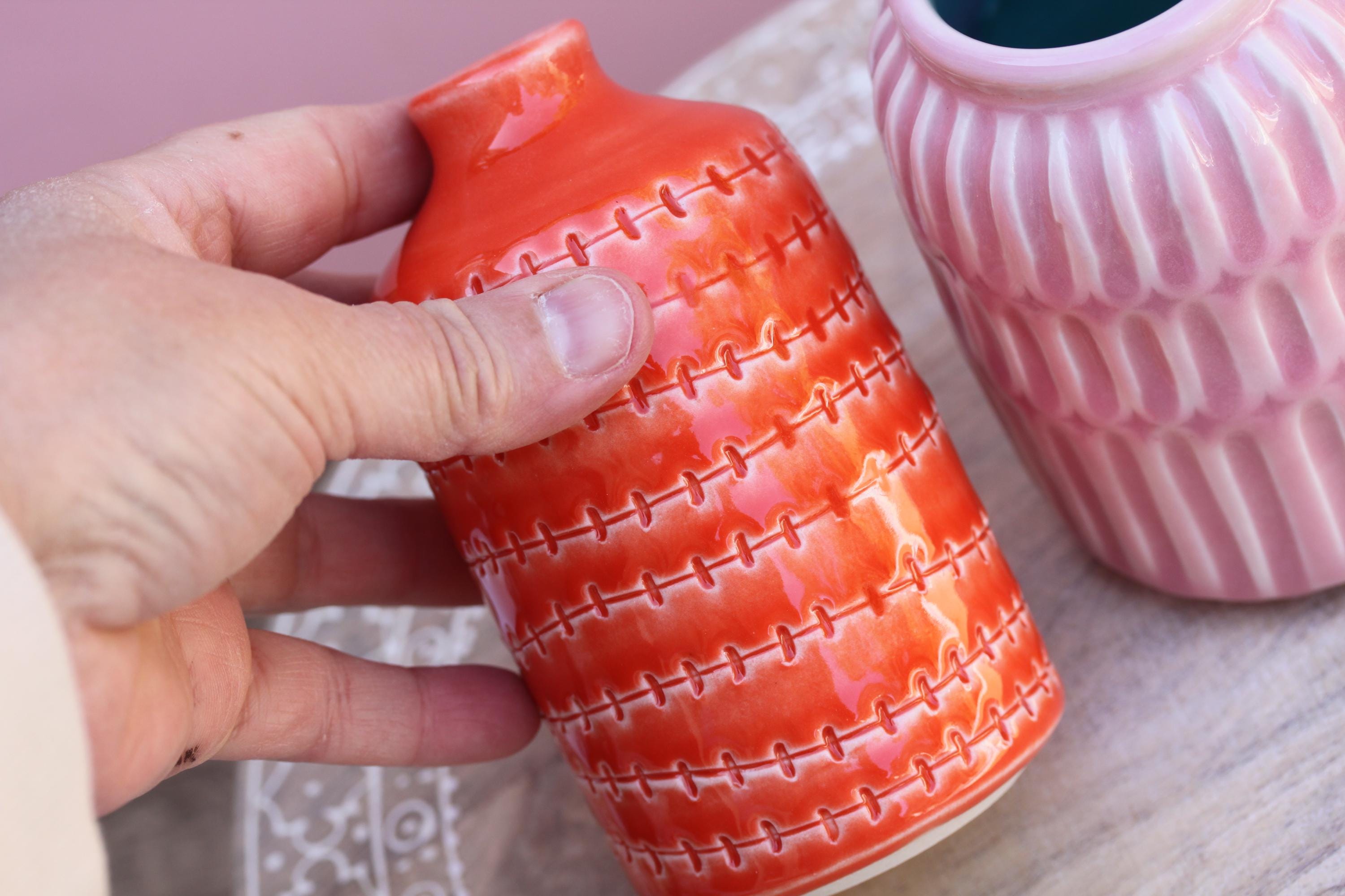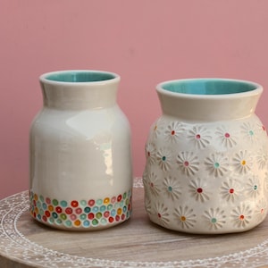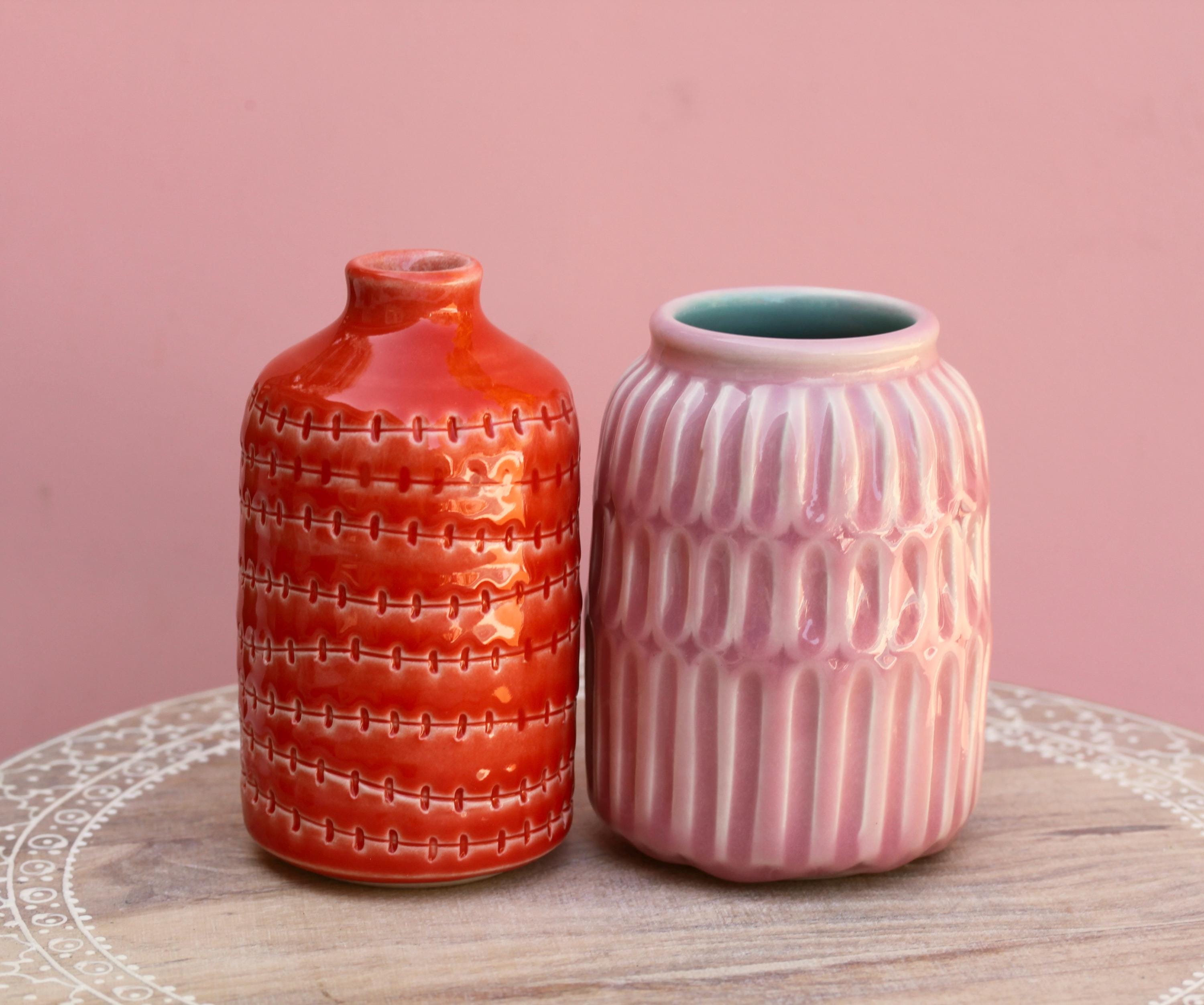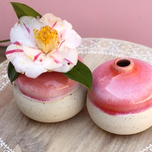 Handmade porcelain bottle vase, listing is for one. Just add blooms and this pretty bud vase is ready to go! Wheel thrown porcelain, carved and glazed with one of our in-house bright glazes.