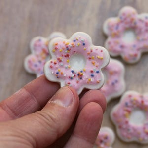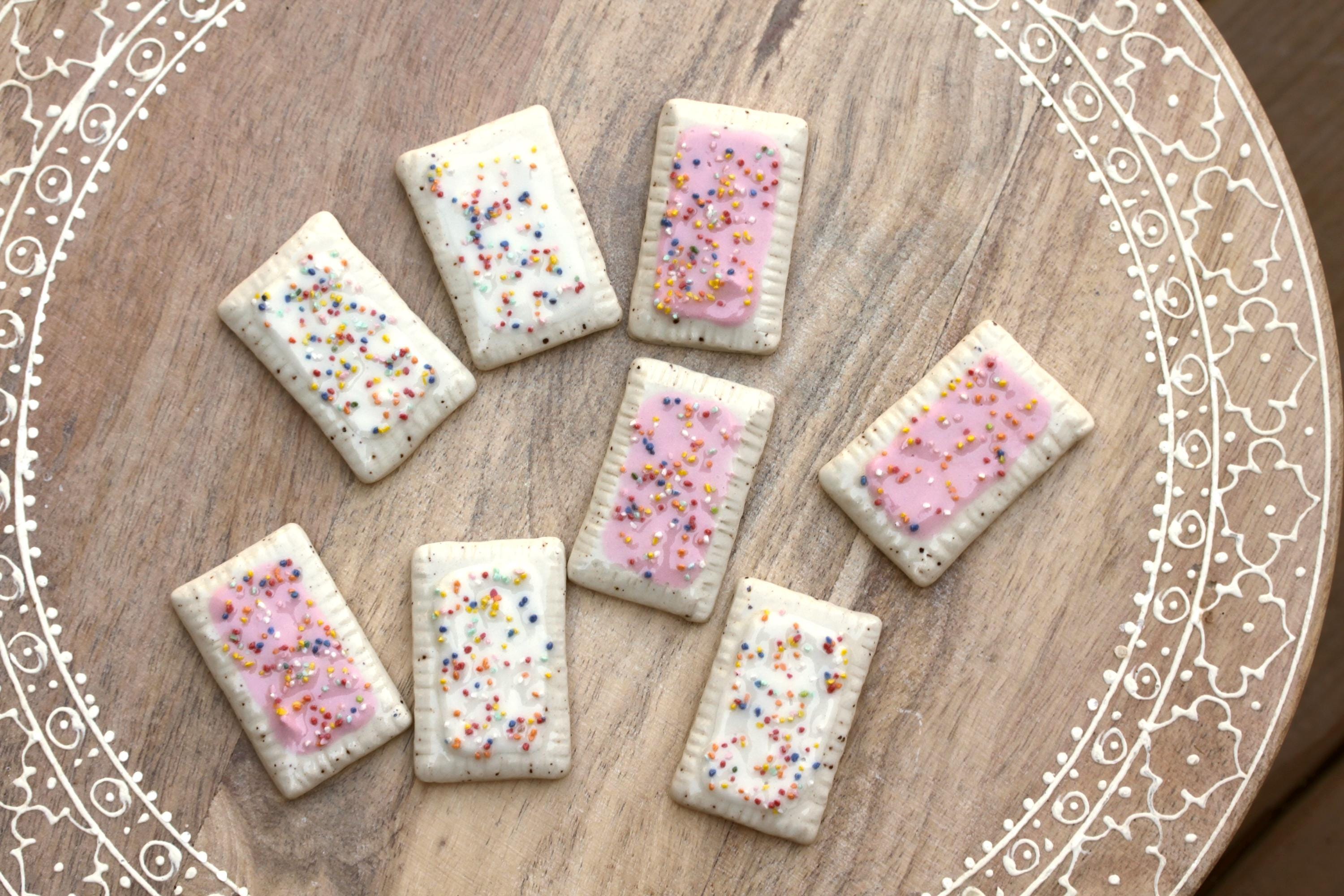 Listing is for one handmade magnet toaster pastry with sprinkles! Handmade from porcelain, glazed with pink or white tinted "slip frosting" and topped with a multiple colored sprinkle mix made from bits of tinted porcelain I made and crushed into little bits for sprinkles. Finished is a glossy clear. The backs are unglazed and have a strong magnet attached.