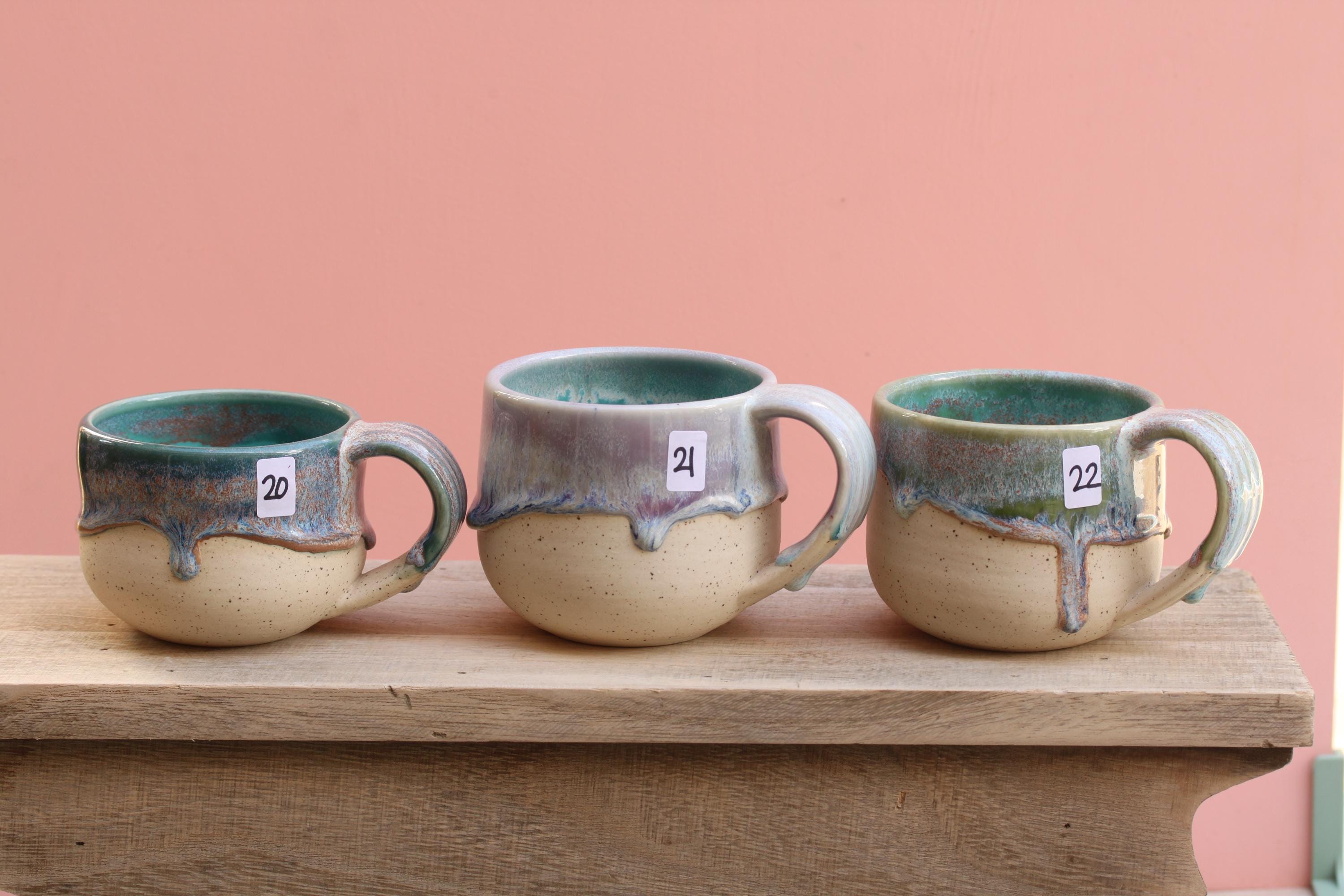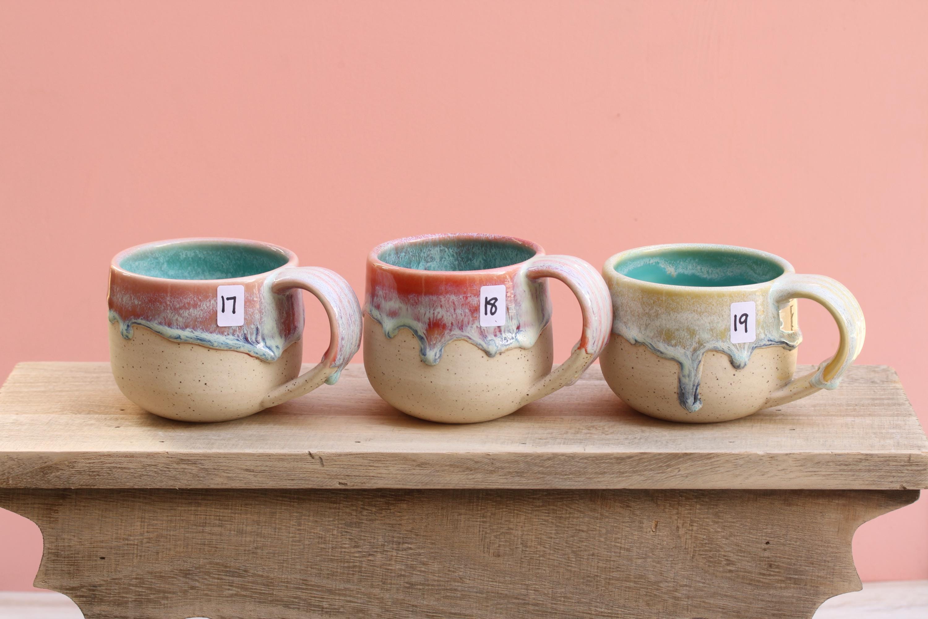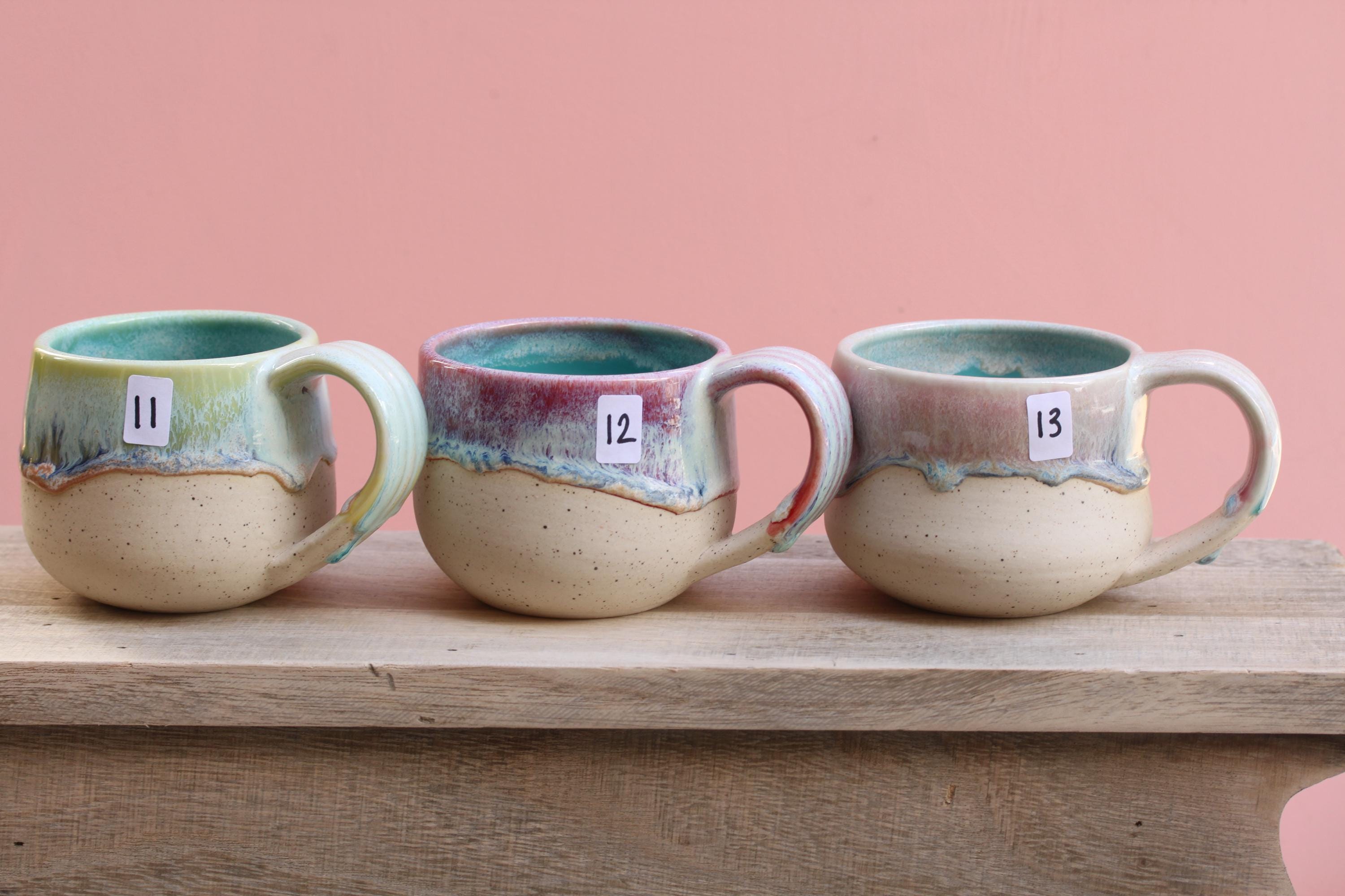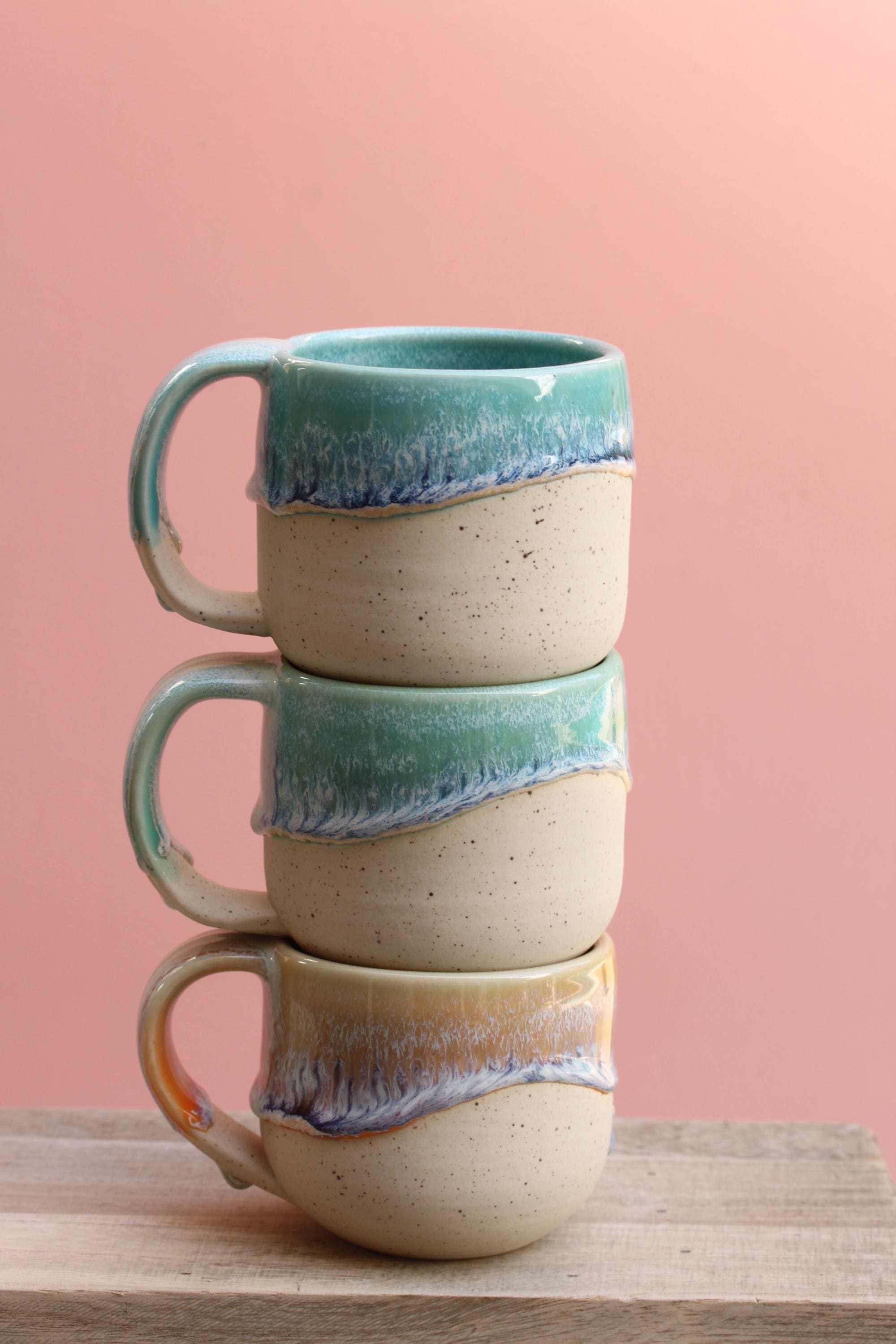 Listing is for one mug, choose your favorite ounces for each listed below. Enjoy your morning coffee or afternoon tea out of this sweet hand made mug, or make it a unique gift for Christmas or someone's birthday! Listing is for one mug in your choice of color. Interiors are all aqua. These have a wide handle which has become my favorite to use!