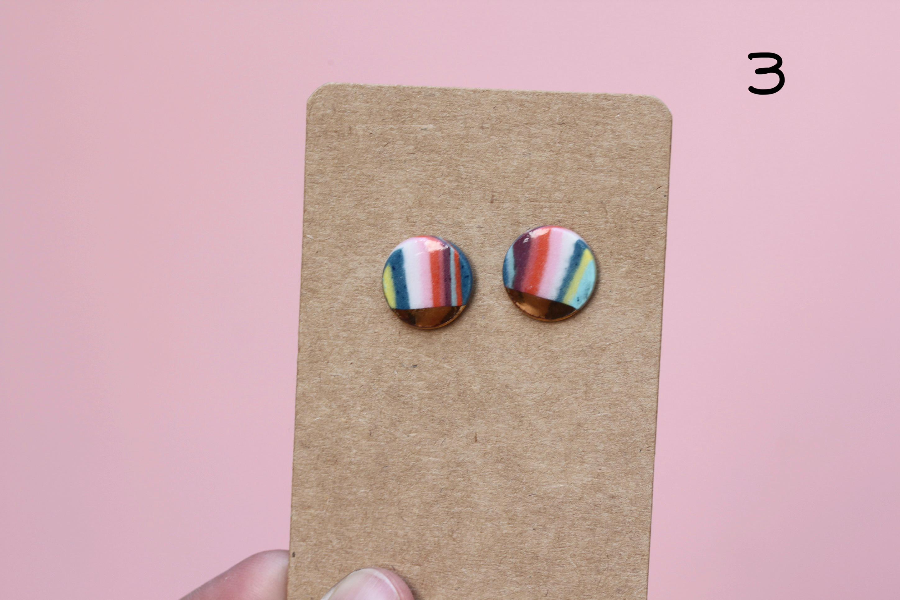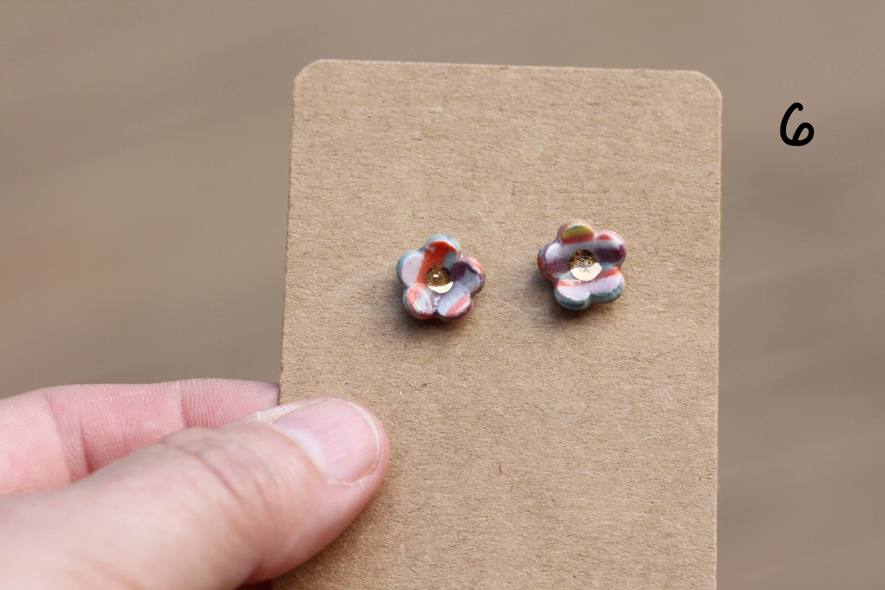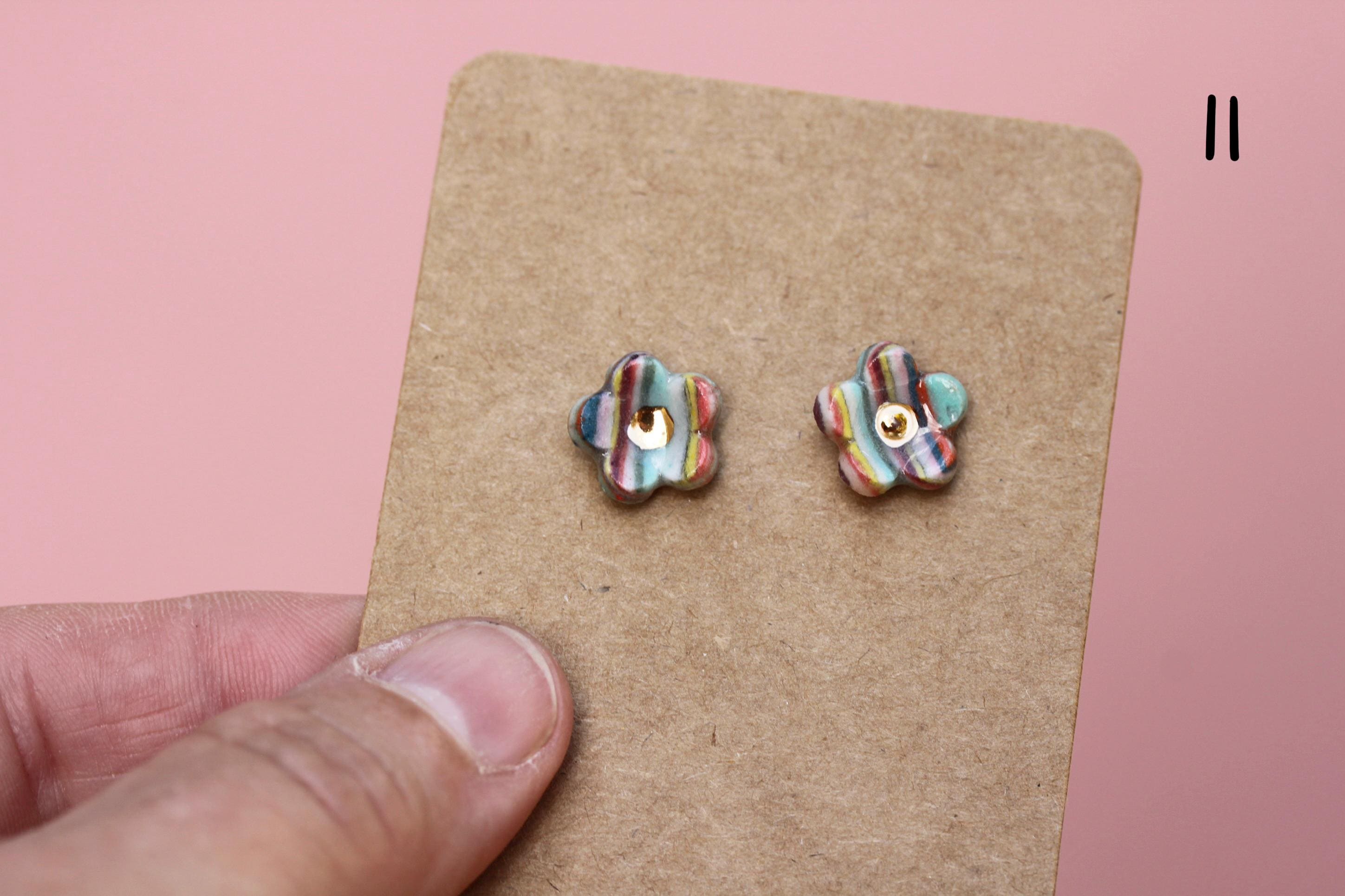 Listing is for one pair, choose your favorite. Posts and post backs are sterling silver. These are made from colored porcelain. I first made several different colors of porcelain by mixing in mason stains to my white porcelain clay and wedge to completely incorporate the stains. I cut and layer these colored and white clays in a stack to make the multicolored "brick" of clay. This is a Japanese process called Nerikomi. I thinly sliced the clay and cut out shapes from the patterned clay.
