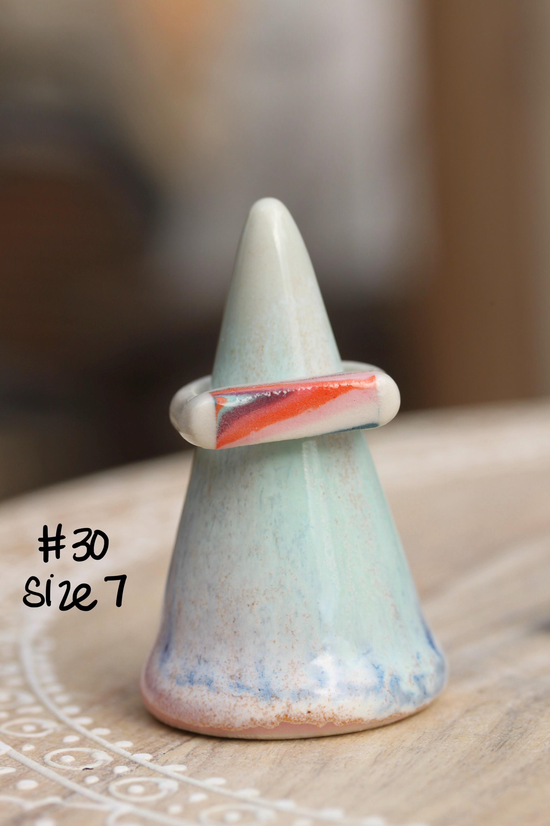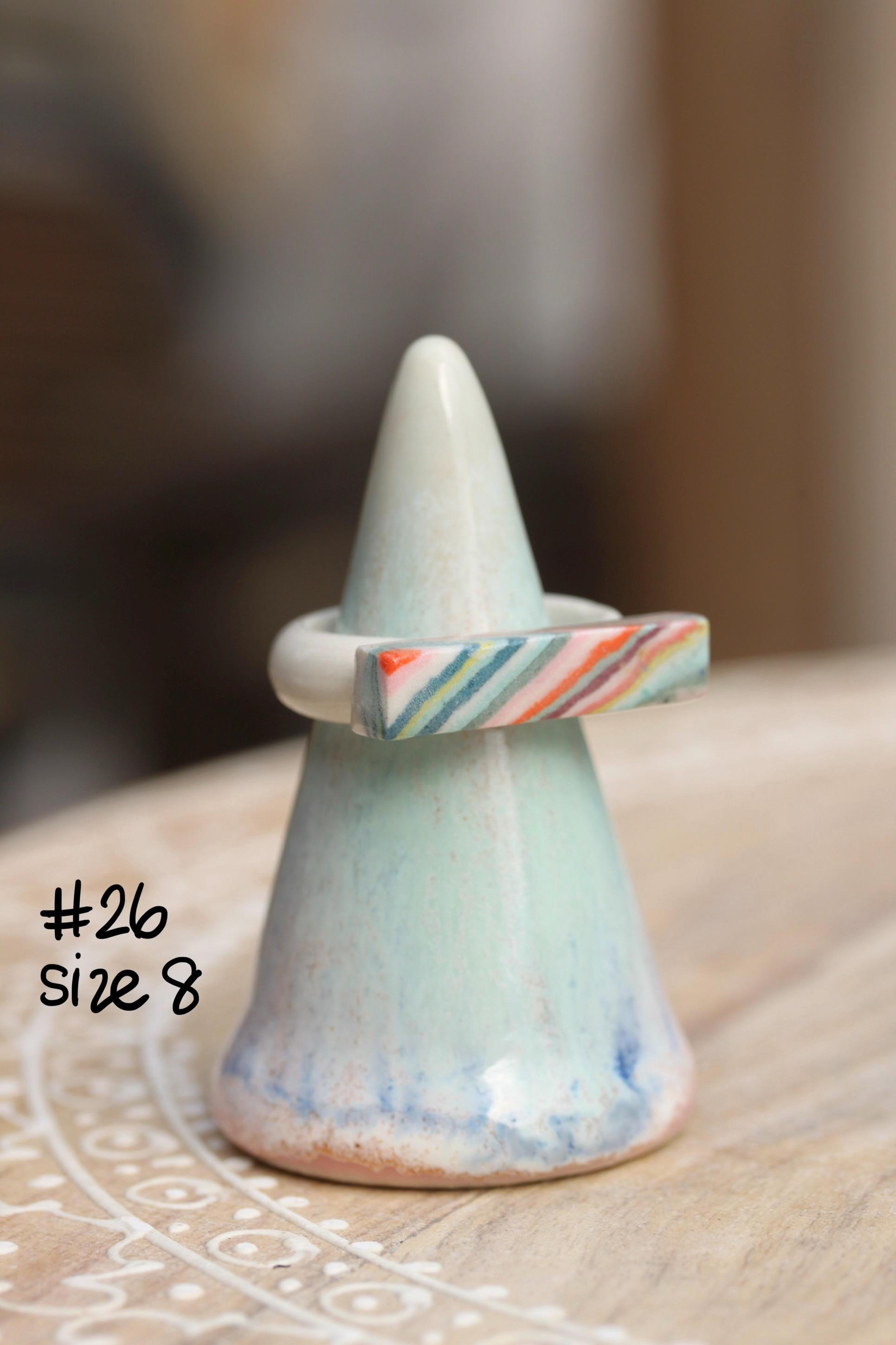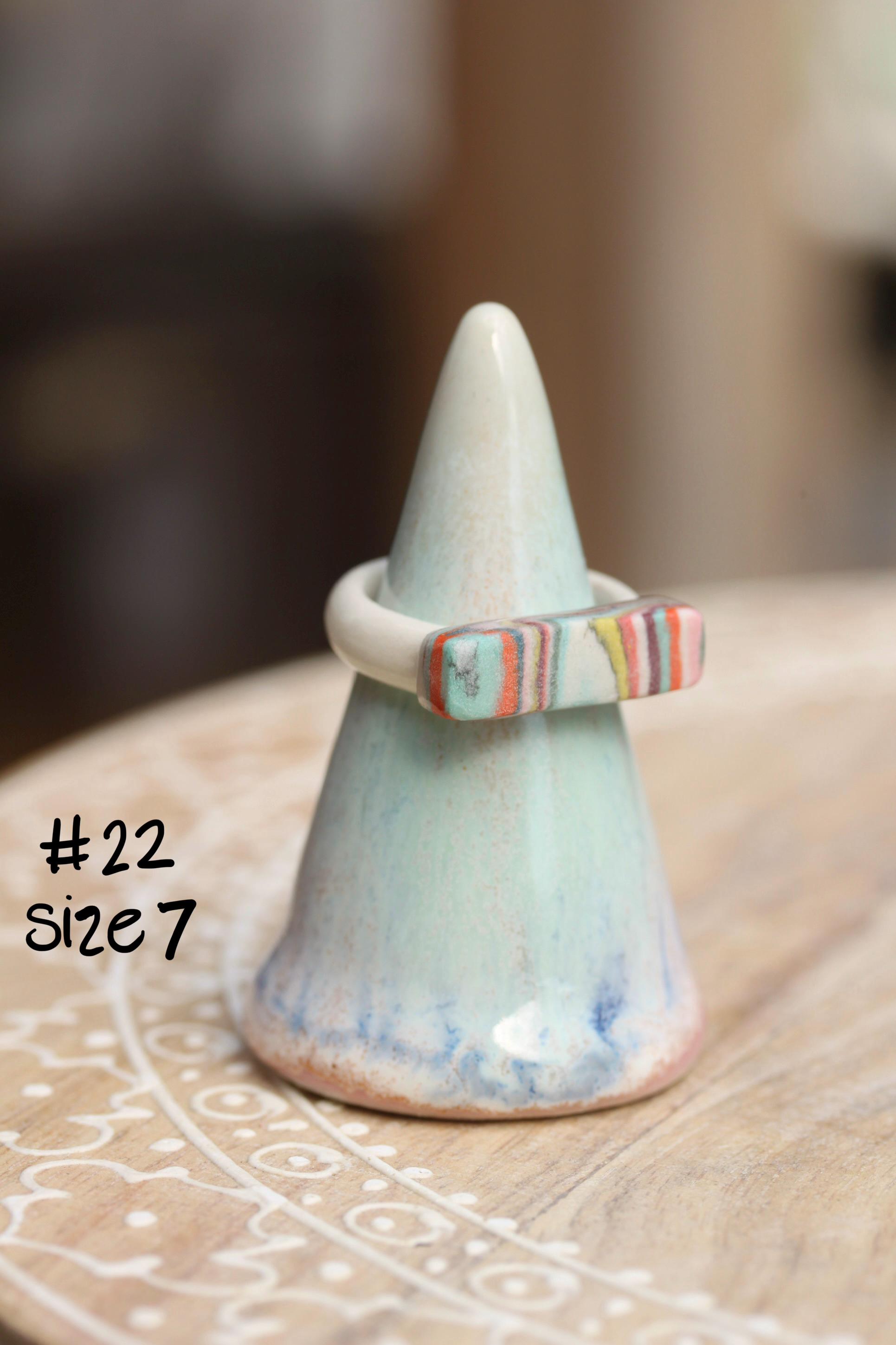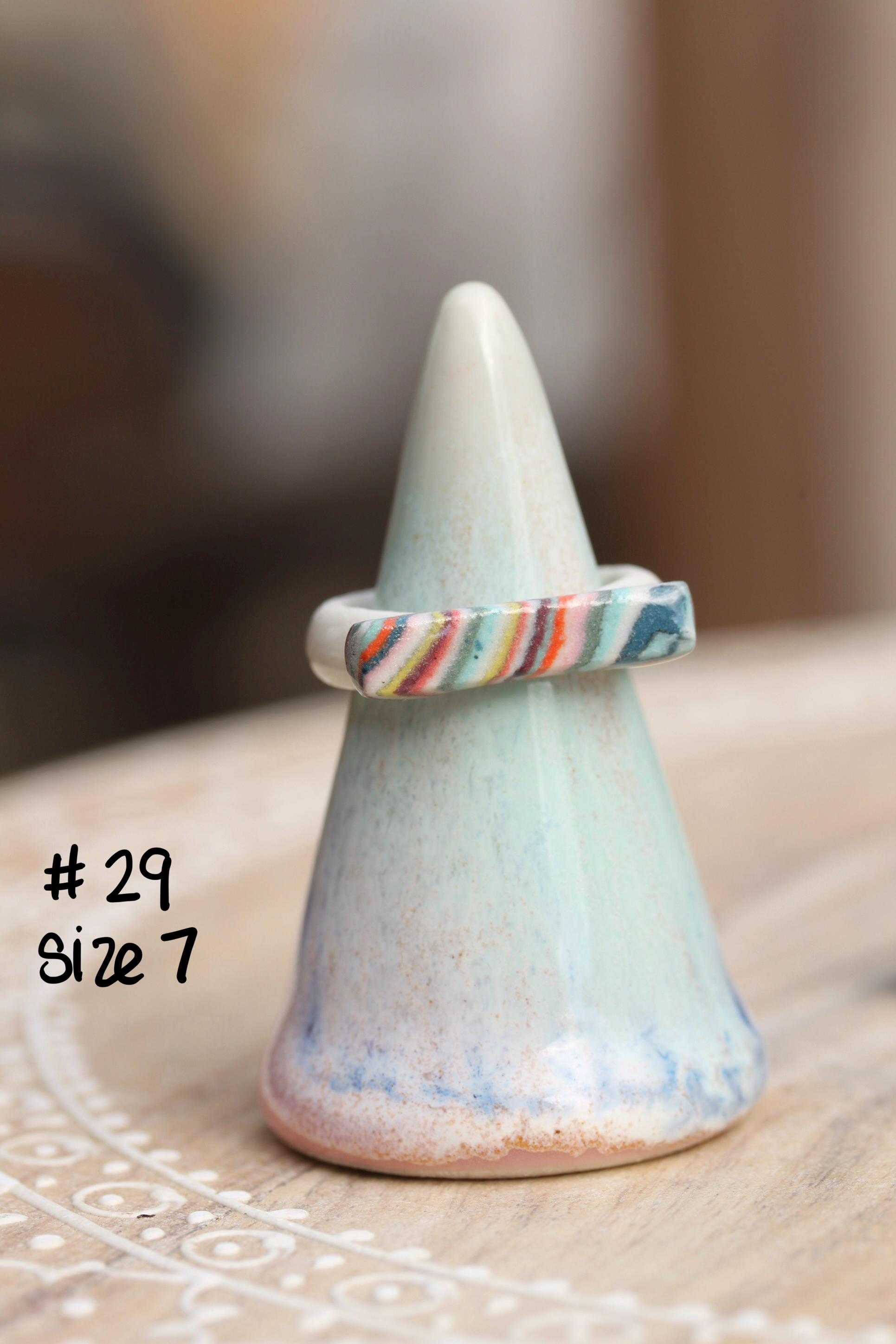 The design element of these rings are made from colored porcelain. I first made several different colors of porcelain by mixing in mason stains to my white porcelain clay and wedge to completely incorporate the stains. I cut and layer these colored and white clays in a stack to make the multicolored "brick" of clay. This is a Japanese process called Nerikomi. I thinly sliced the clay and cut out shapes from the patterned clay. The interior of the band has a clear smooth glaze, some of the exterior bands are glazed some are not depending on design and how I needed to fire them. I've glazed most of the colored part of the ring but a few I've left unglazed.