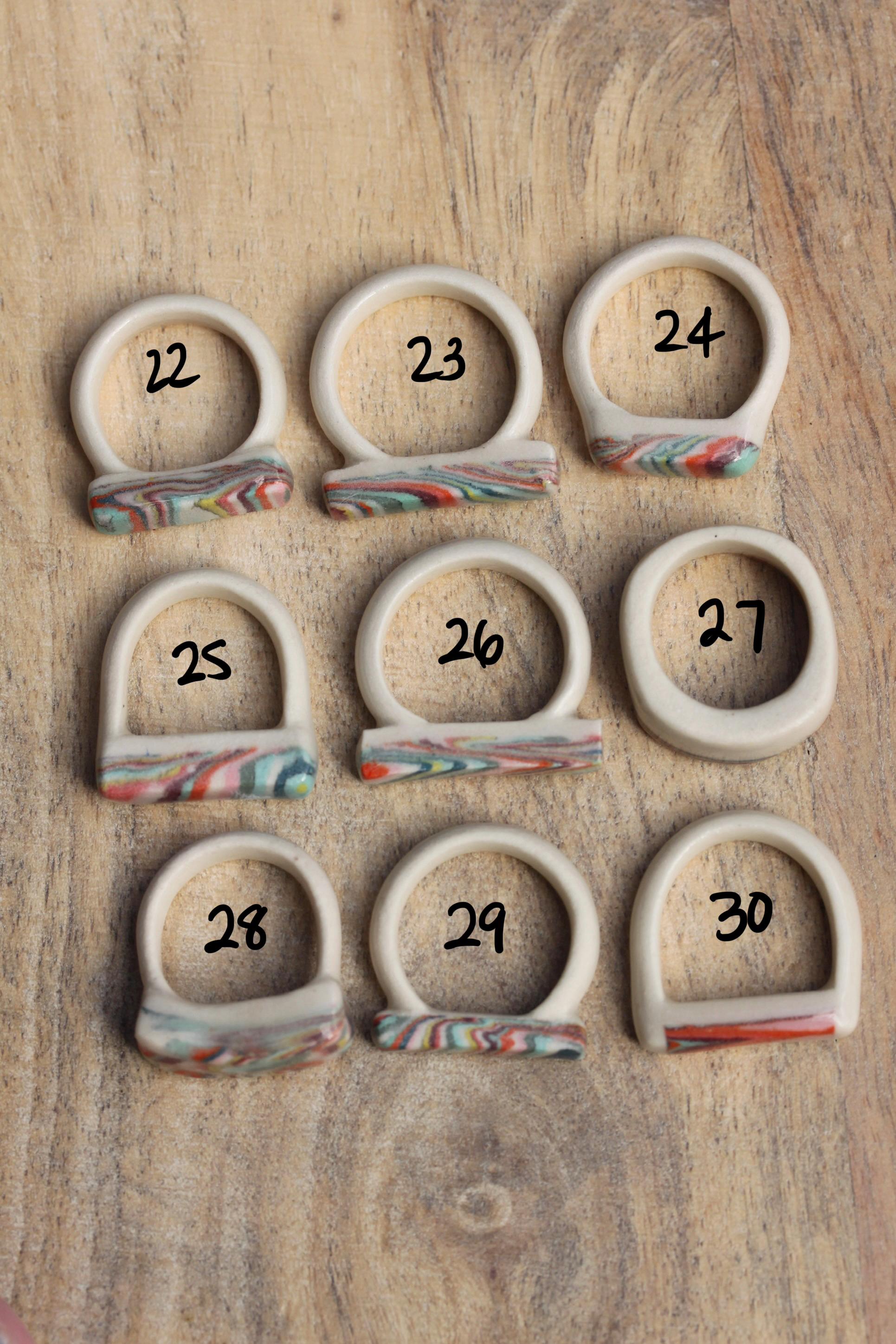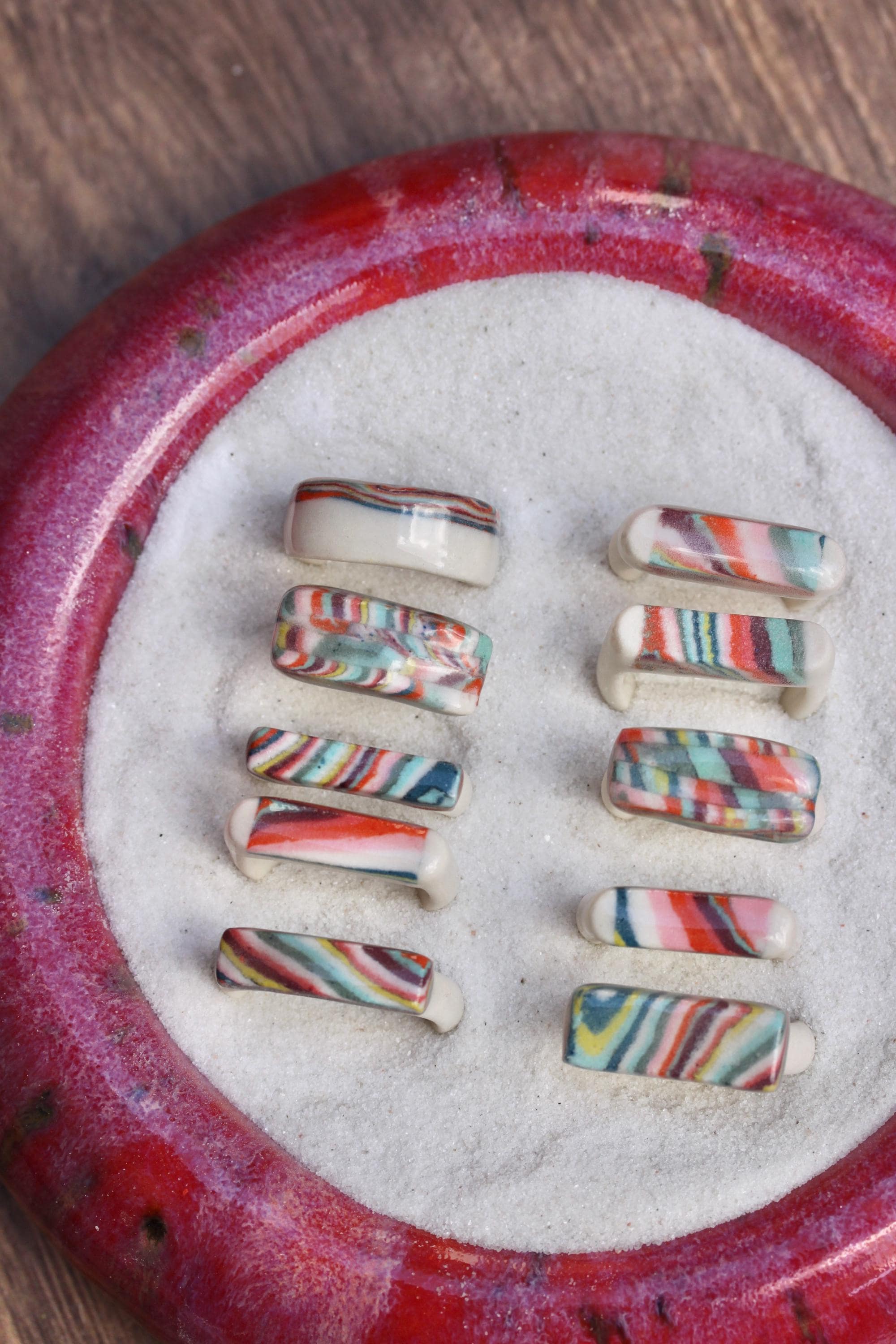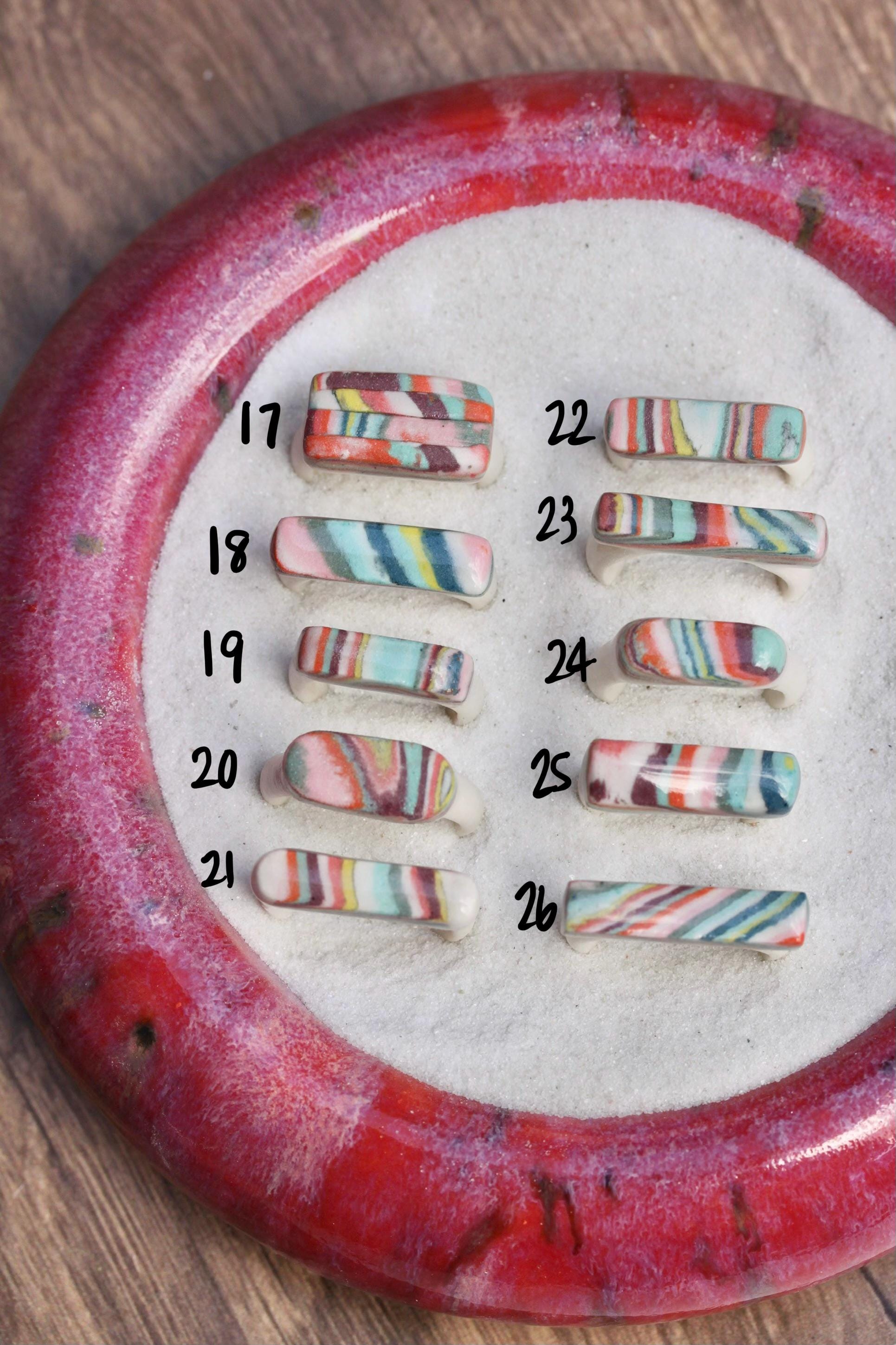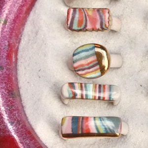 The design element of these rings are made from colored porcelain. I first made several different colors of porcelain by mixing in mason stains to my white porcelain clay and wedge to completely incorporate the stains. I cut and layer these colored and white clays in a stack to make the multicolored "brick" of clay. This is a Japanese process called Nerikomi. I thinly sliced the clay and cut out shapes from the patterned clay. The interior of the band has a clear smooth glaze, some of the exterior bands are glazed some are not depending on design and how I needed to fire them. I've glazed most of the colored part of the ring but a few I've left unglazed.