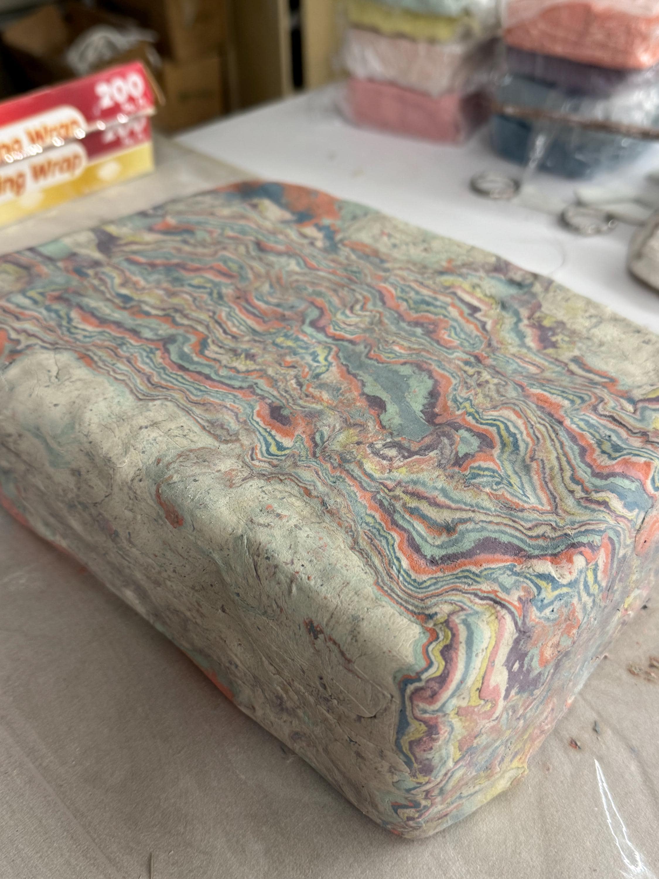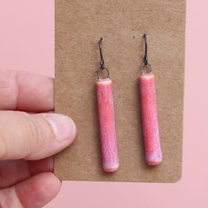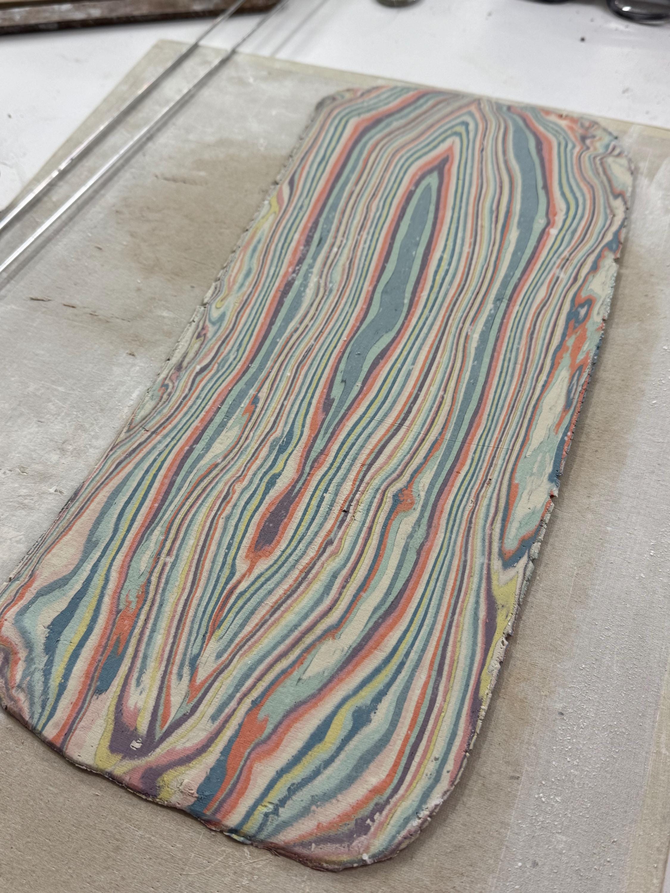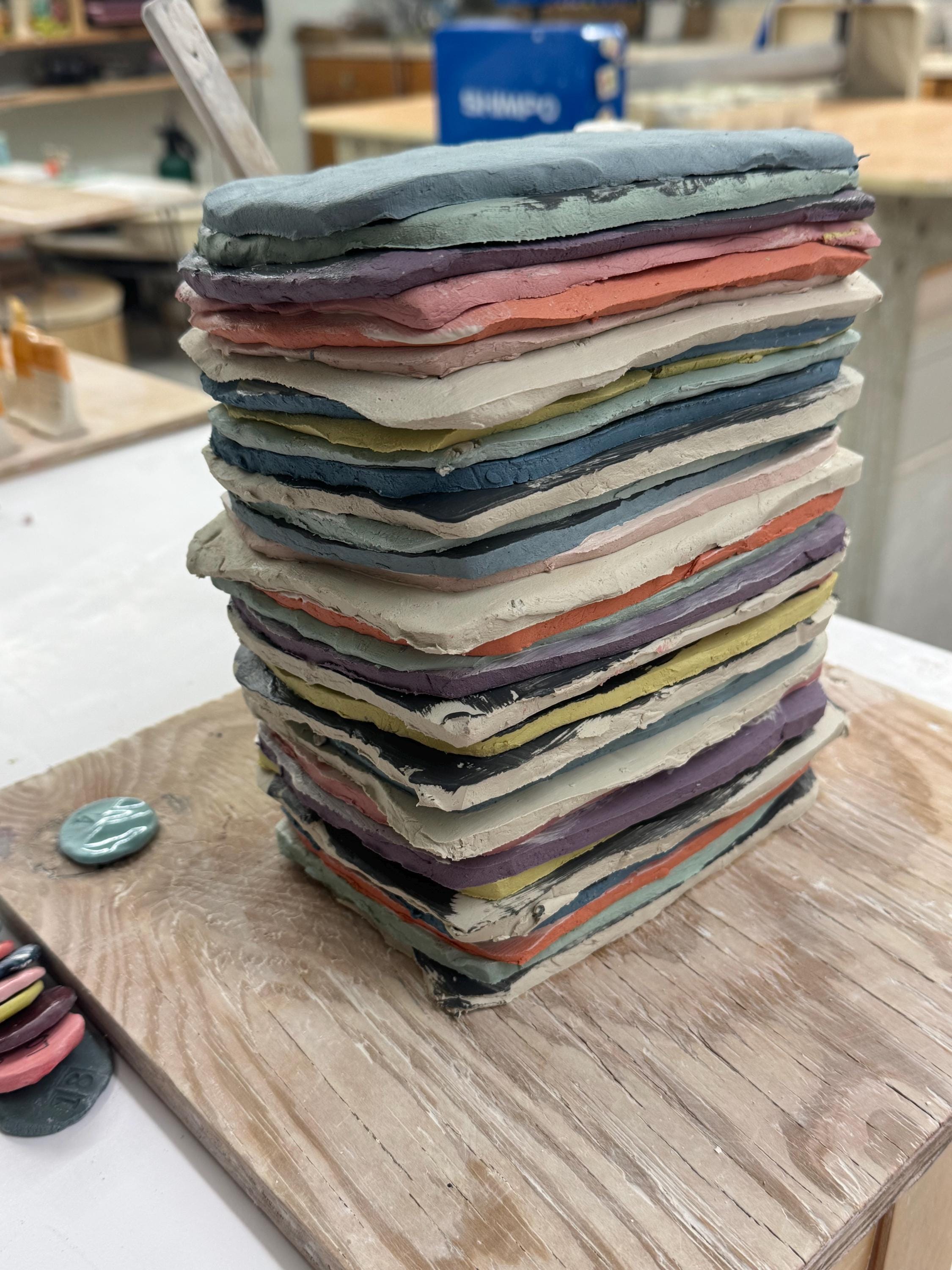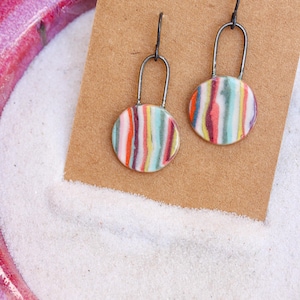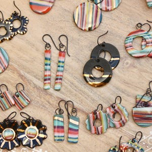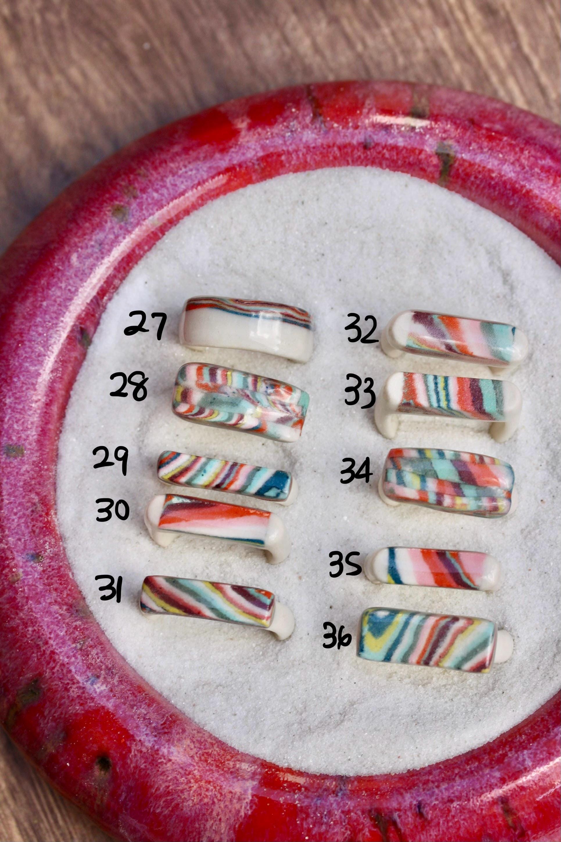 The design element of these rings are made from colored porcelain. I first made several different colors of porcelain by mixing in mason stains to my white porcelain clay and wedge to completely incorporate the stains. I cut and layer these colored and white clays in a stack to make the multicolored "brick" of clay. This is a Japanese process called Nerikomi. I thinly sliced the clay and cut out shapes from the patterned clay. The interior of the band has a clear smooth glaze, some of the exterior bands are glazed some are not depending on design and how I needed to fire them. I've glazed most of the colored part of the ring but a few I've left unglazed.