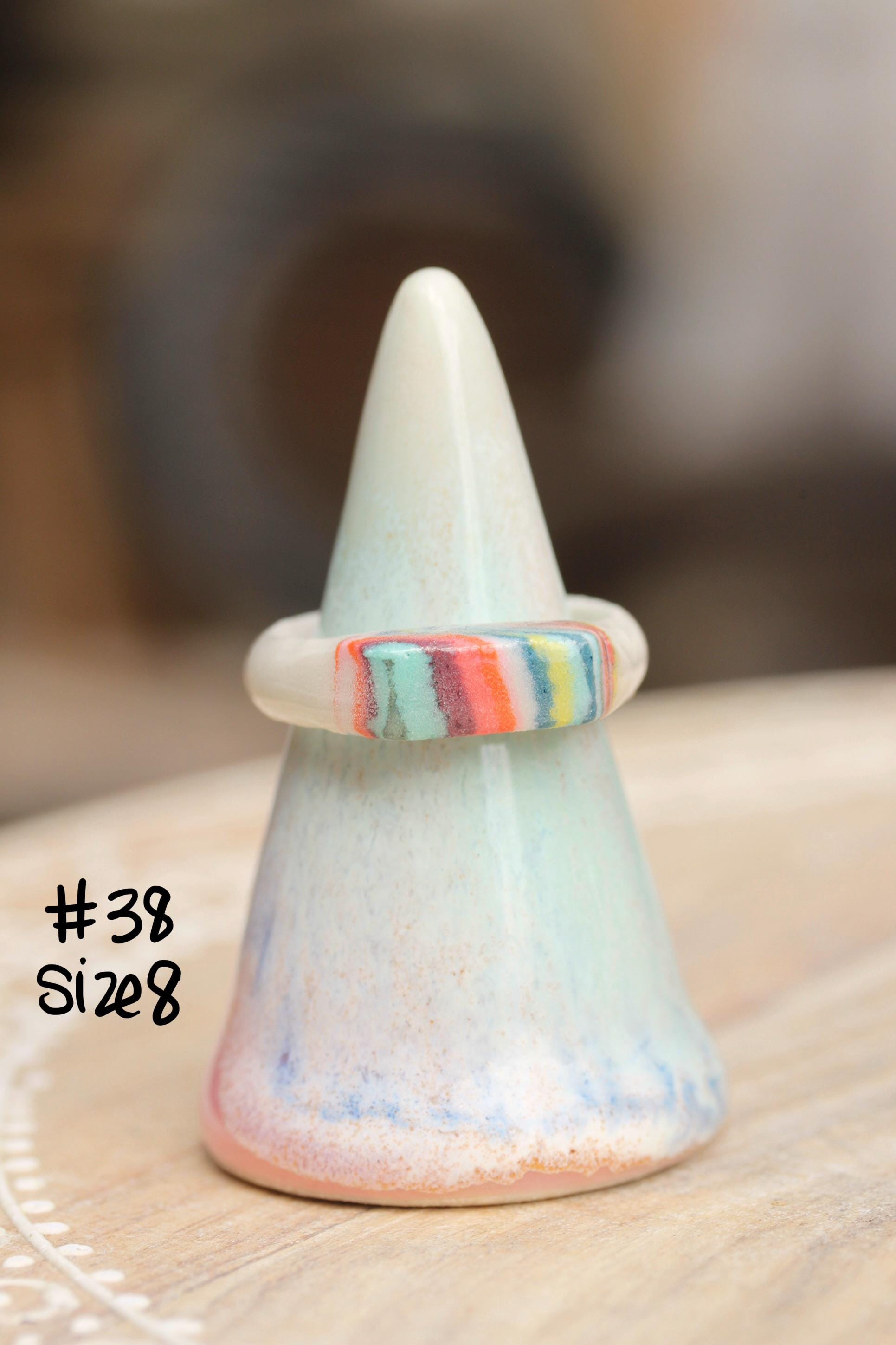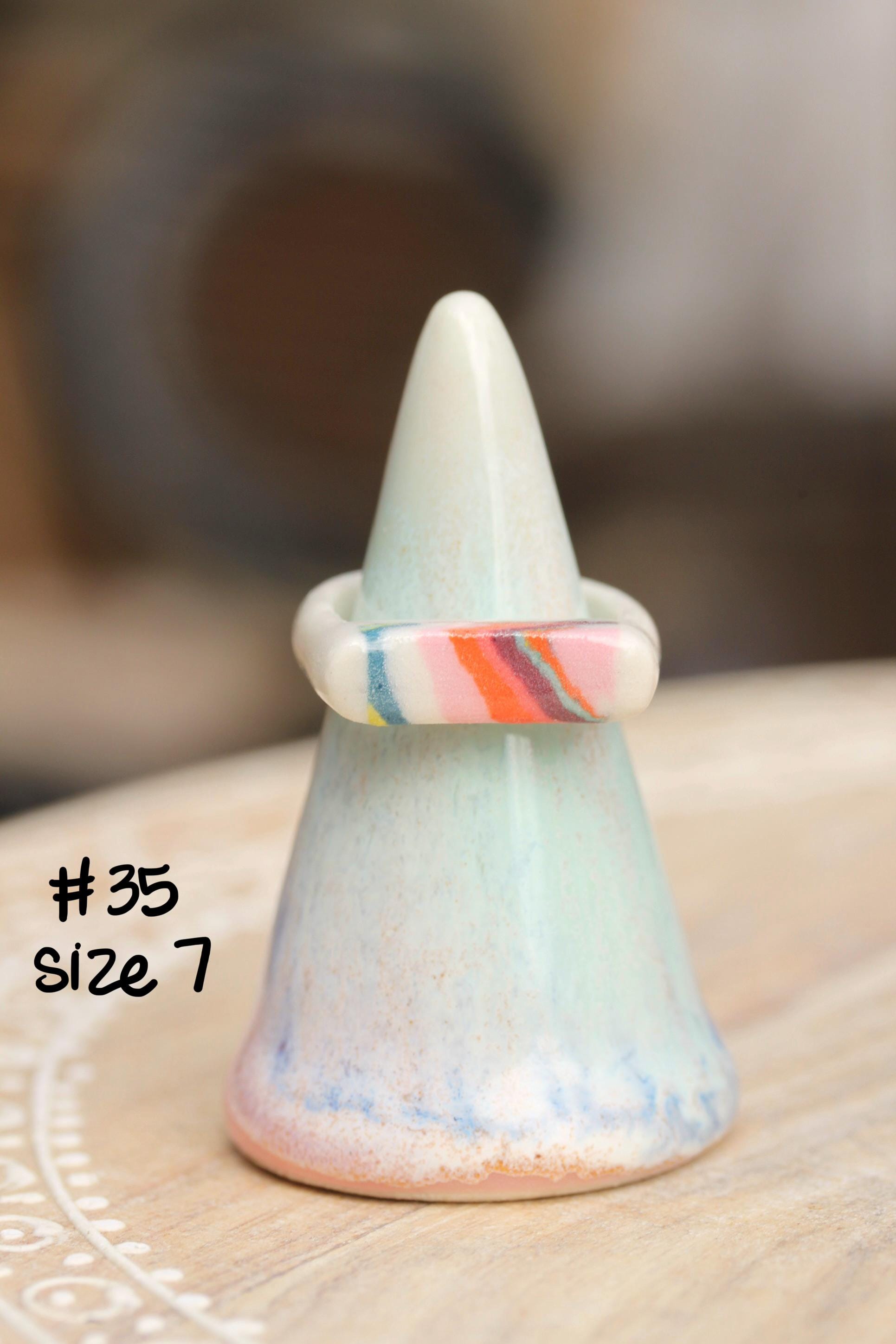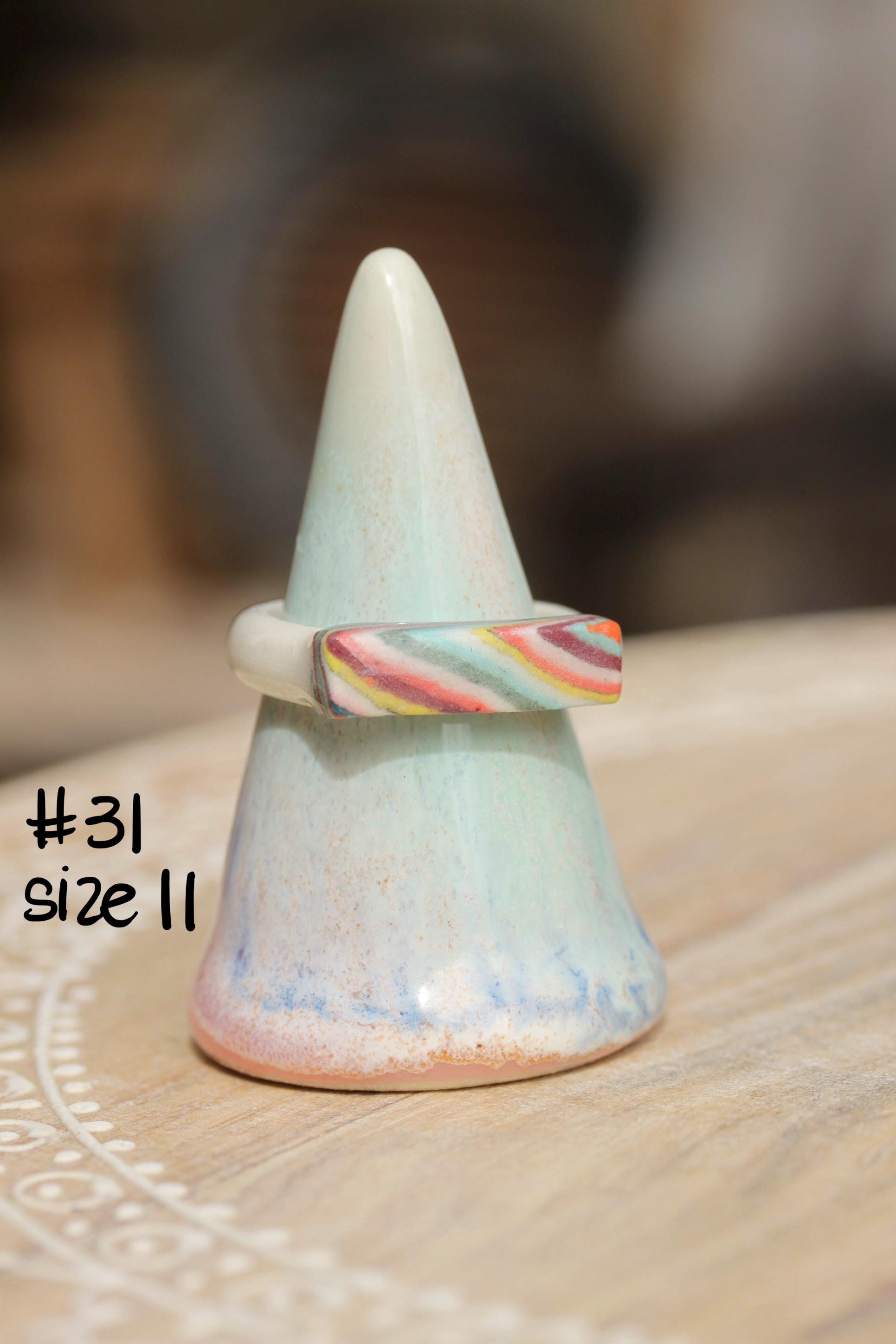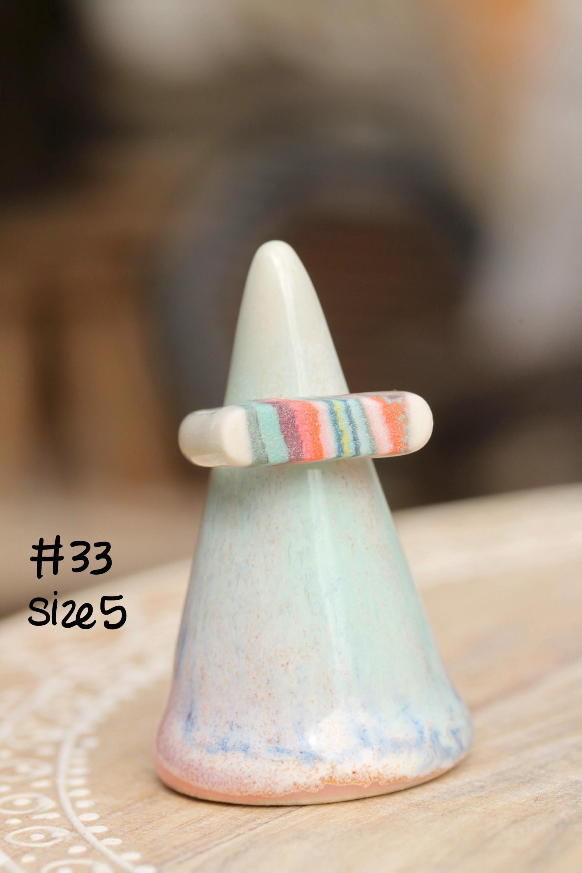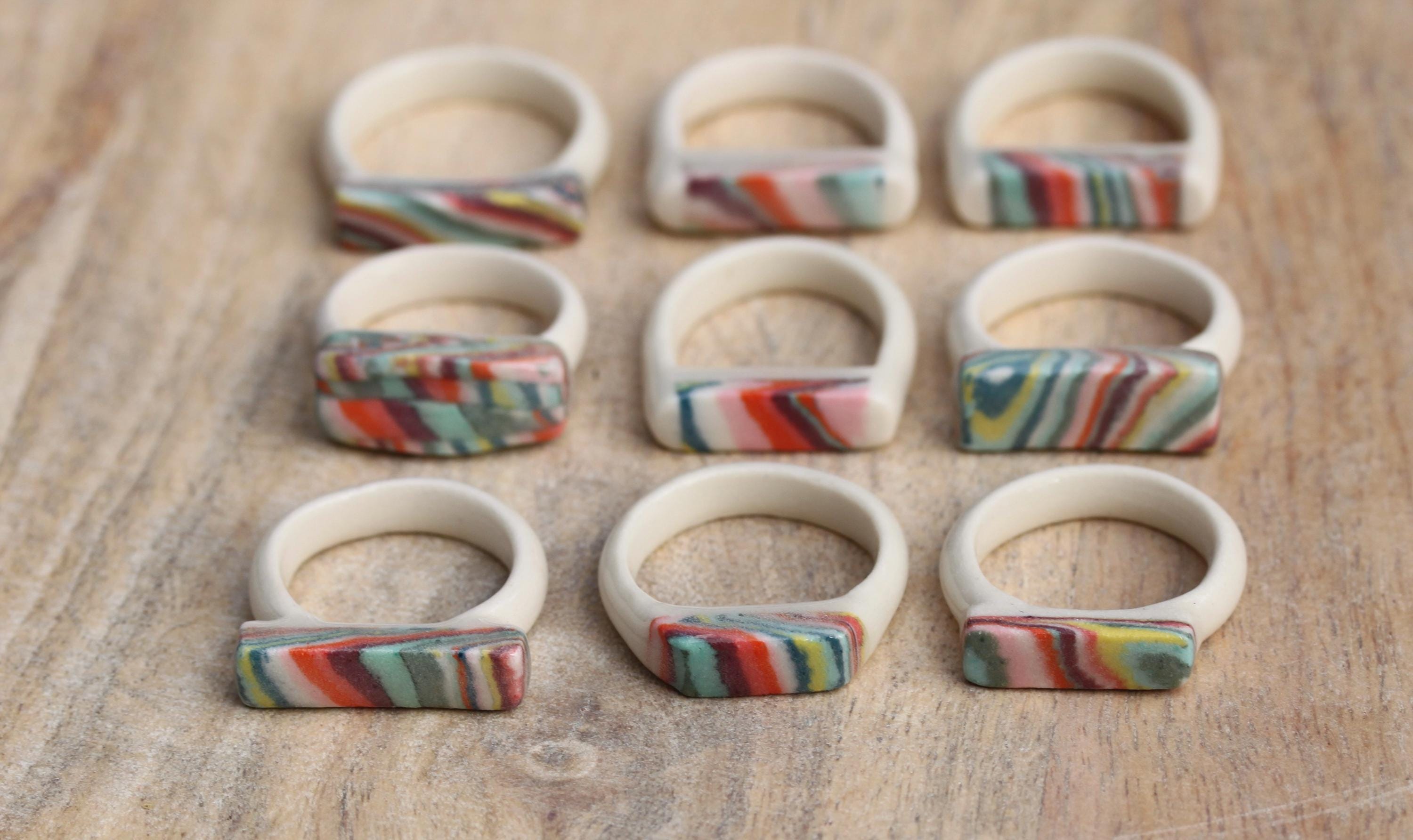 The design element of these rings are made from colored porcelain. I first made several different colors of porcelain by mixing in mason stains to my white porcelain clay and wedge to completely incorporate the stains. I cut and layer these colored and white clays in a stack to make the multicolored "brick" of clay. This is a Japanese process called Nerikomi. I thinly sliced the clay and cut out shapes from the patterned clay. The interior of the band has a clear smooth glaze, some of the exterior bands are glazed some are not depending on design and how I needed to fire them. I've glazed most of the colored part of the ring but a few I've left unglazed.