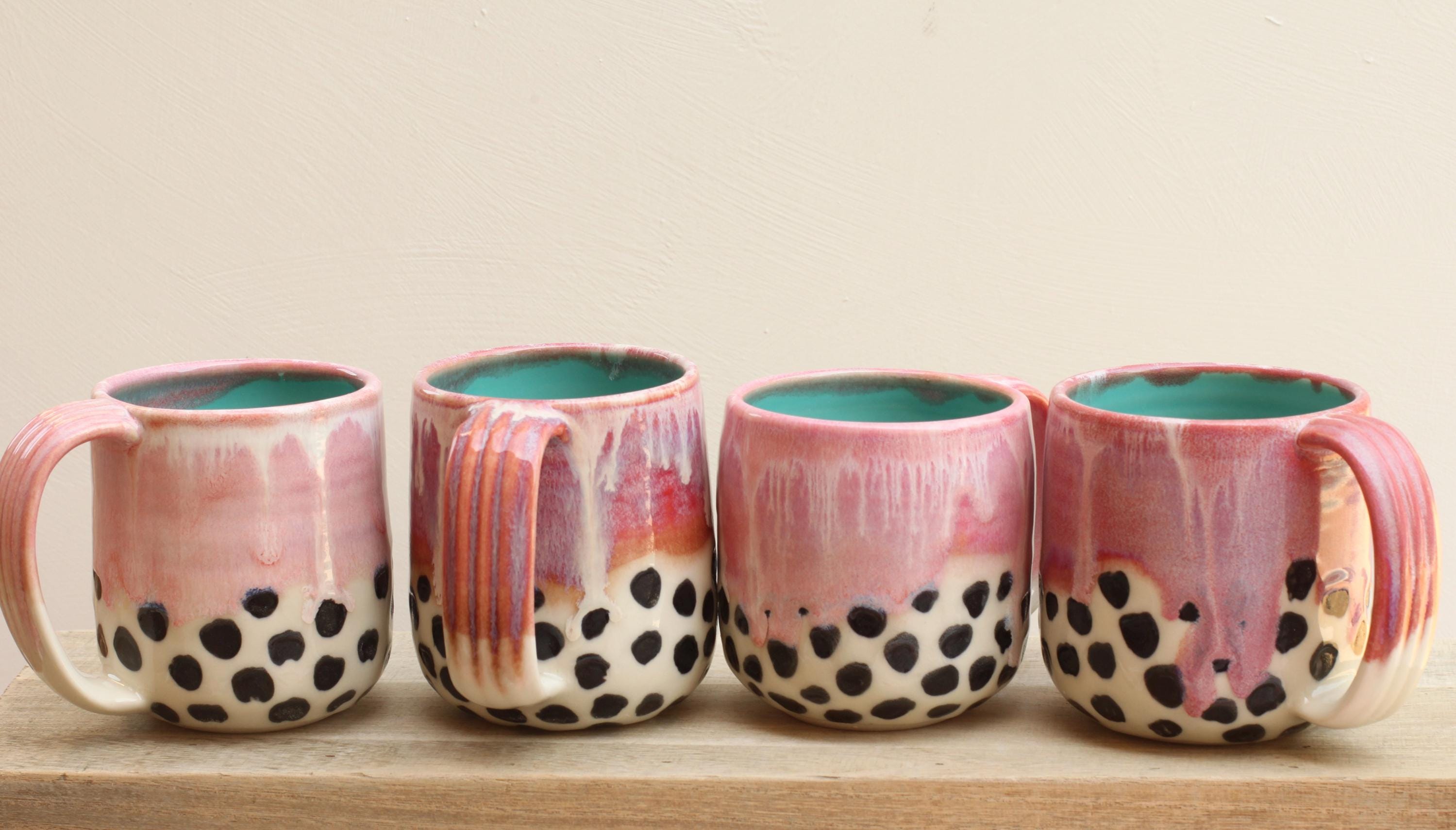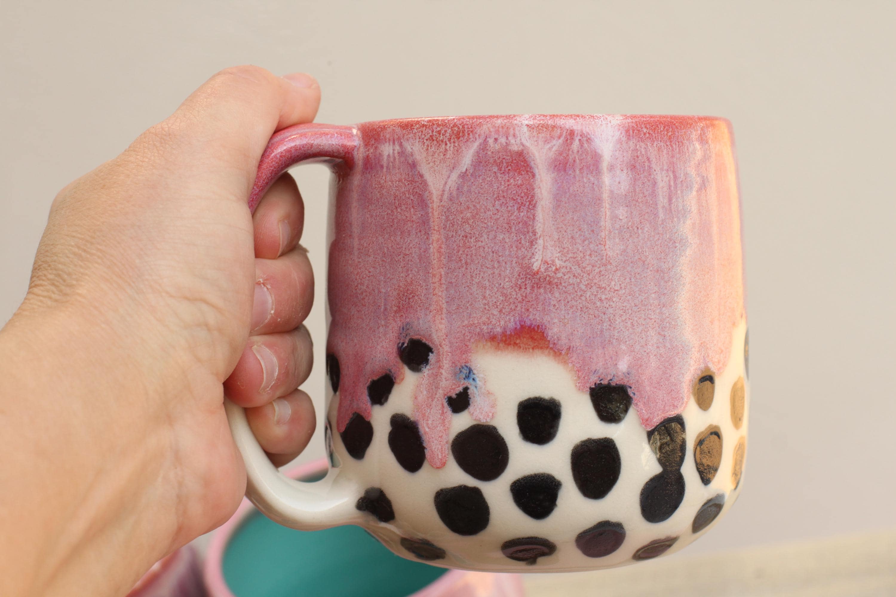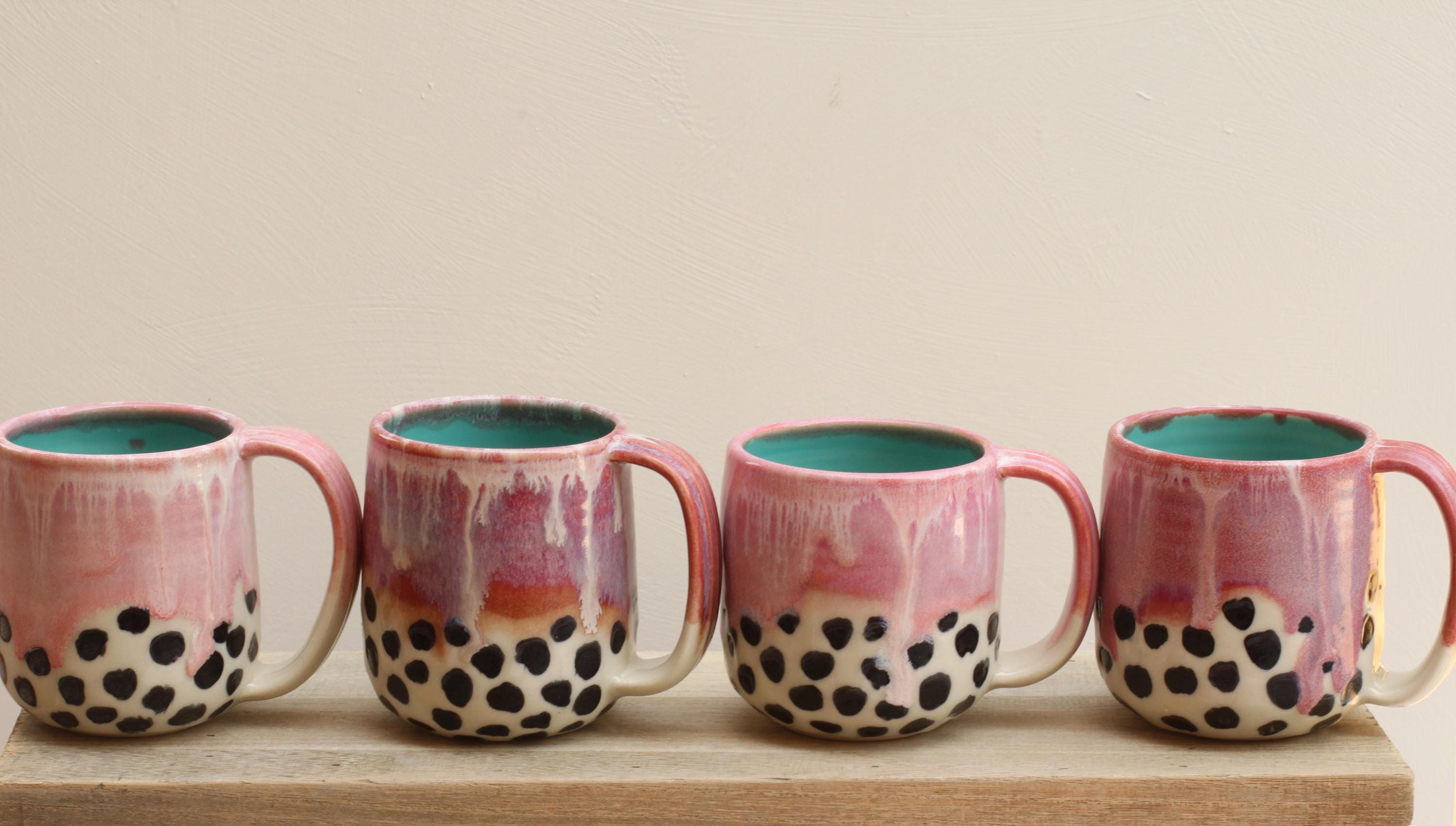 Each mug is wheel thrown using porcelain and layered with glazes. Bottom half of mug has black spot pattern with a clear glaze. We glaze and then fire the piece in the kiln to over 2200~F. The mug is food, microwave, and dishwasher safe.