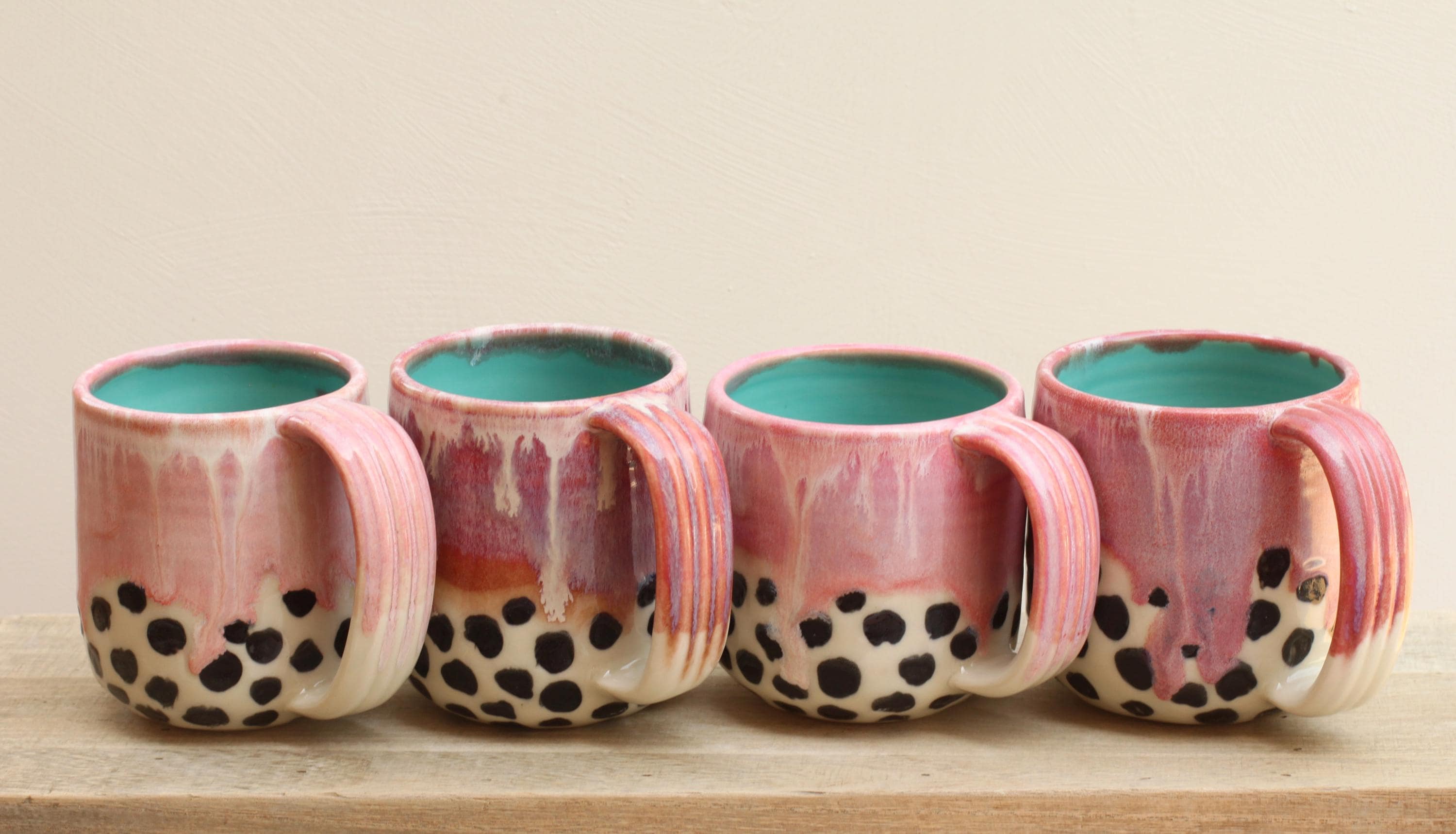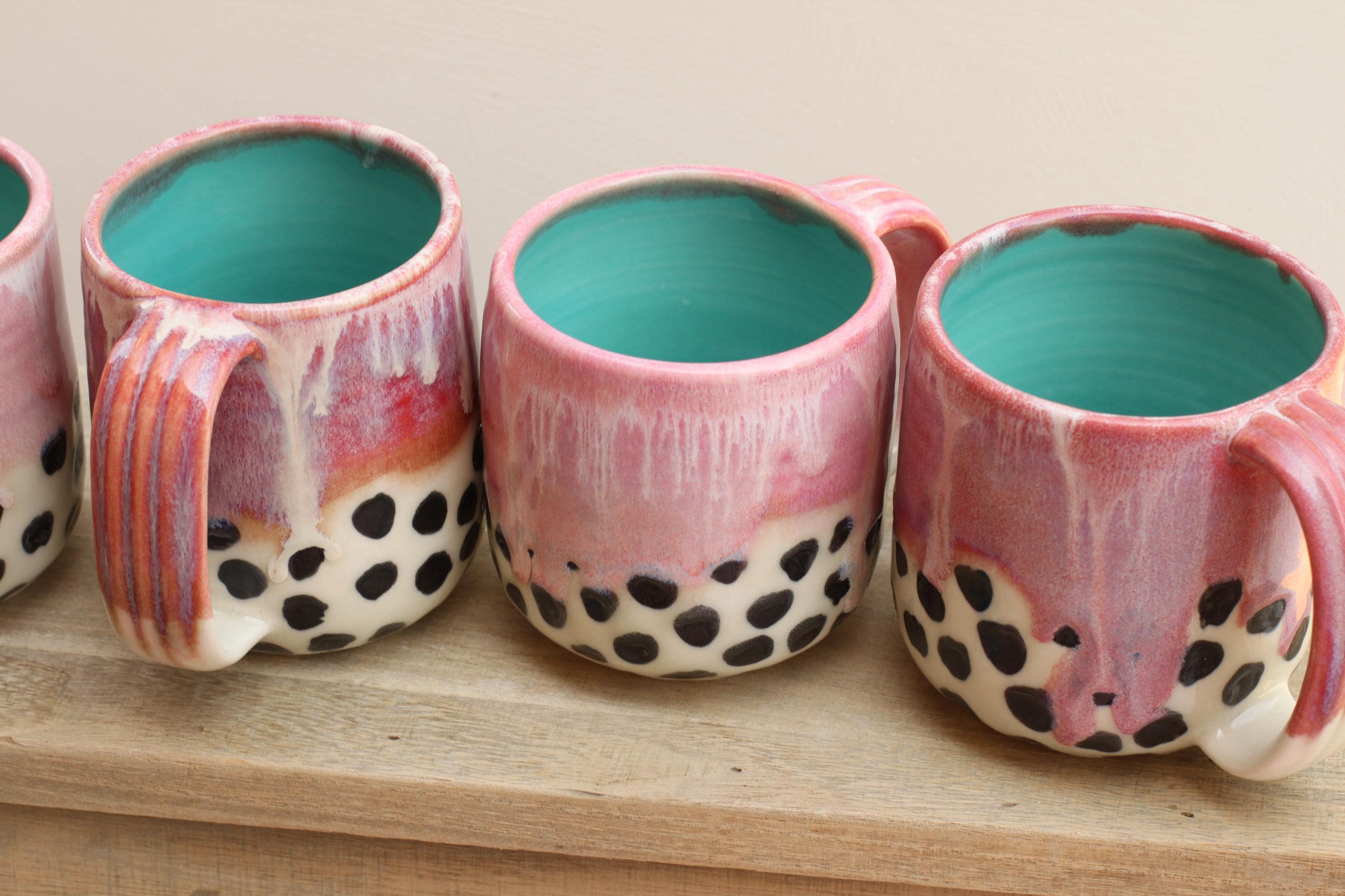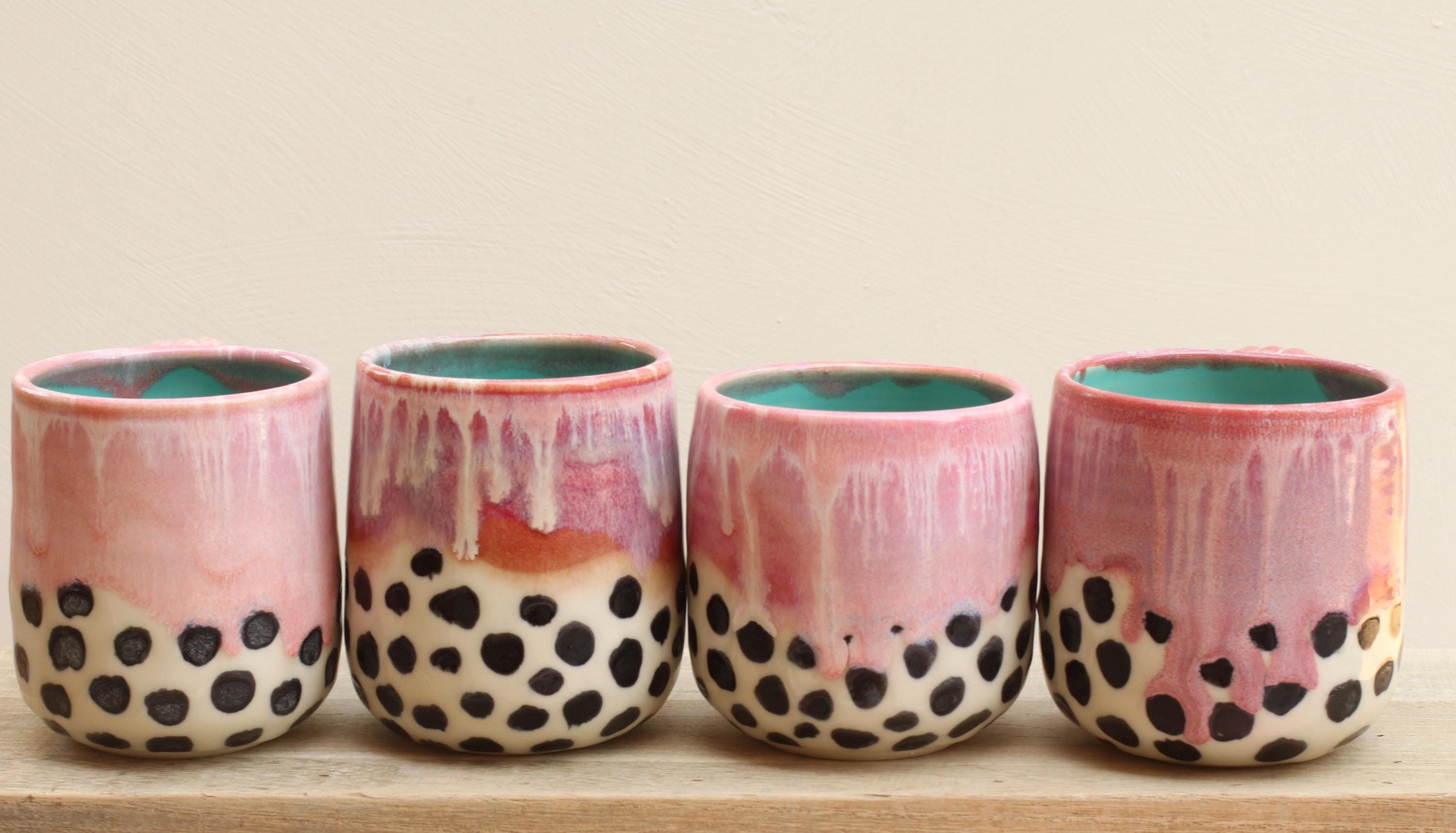 Each mug is wheel thrown using porcelain and layered with glazes. Bottom half of mug has black spot pattern with a clear glaze. We glaze and then fire the piece in the kiln to over 2200~F. The mug is food, microwave, and dishwasher safe.