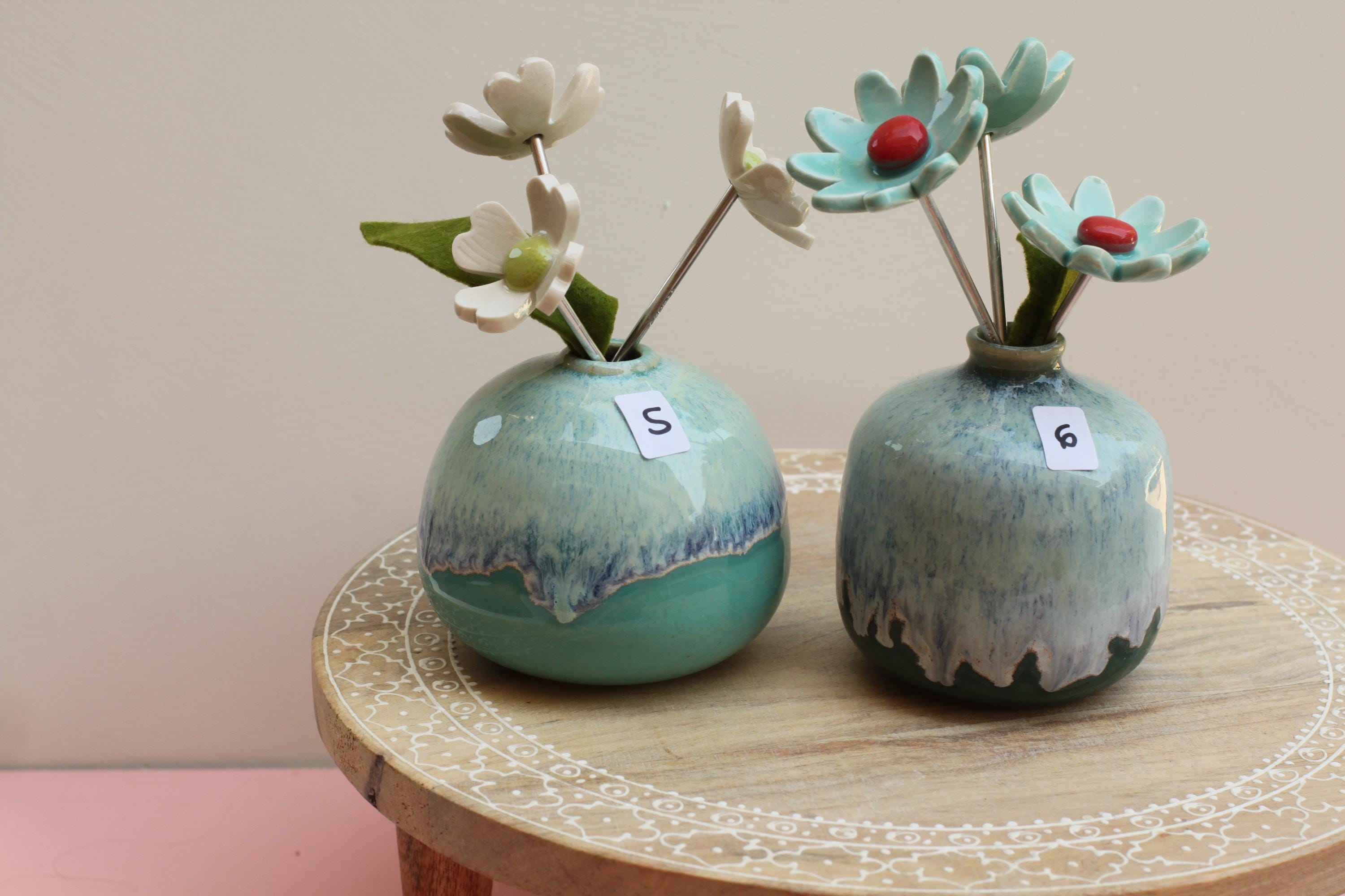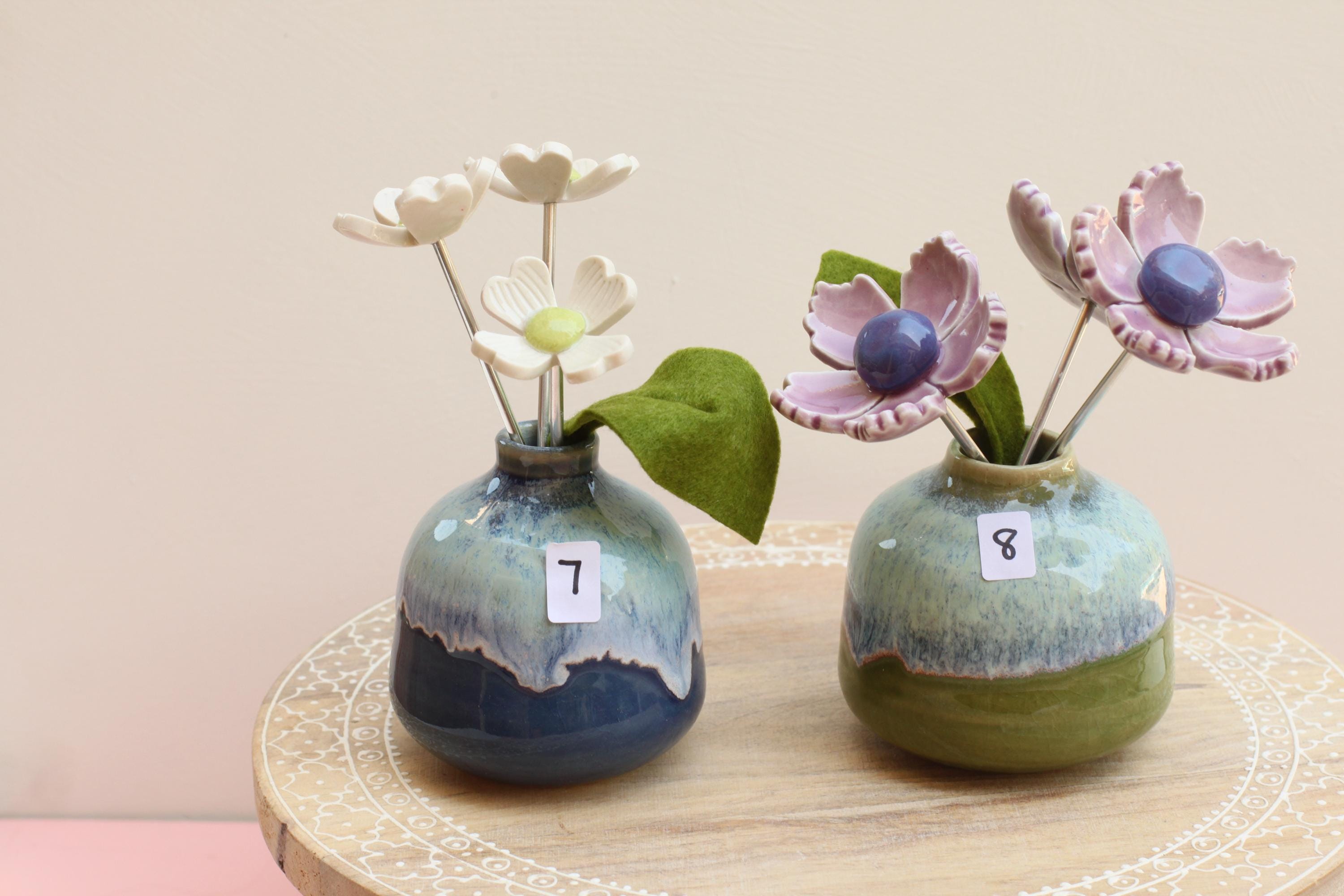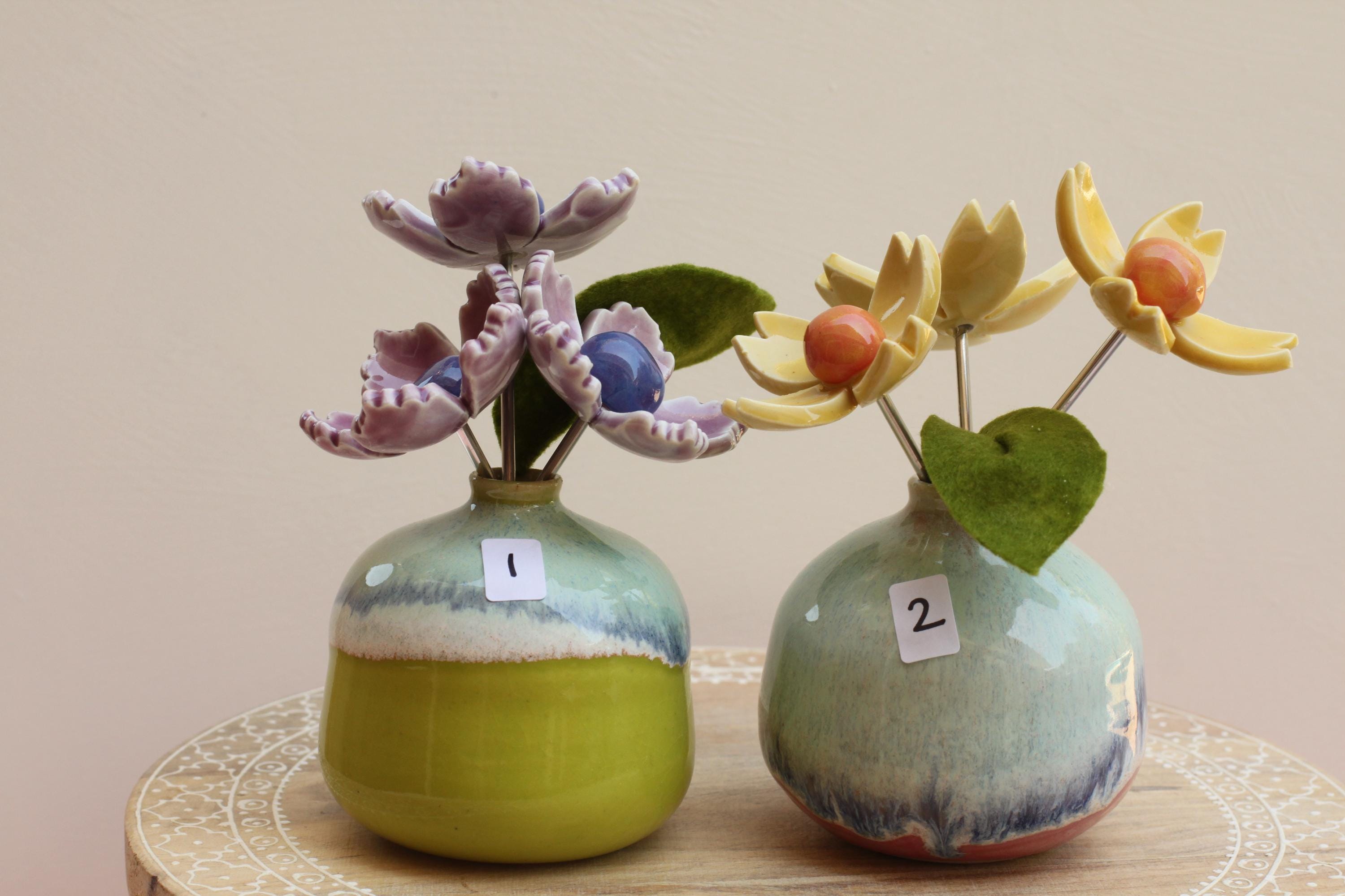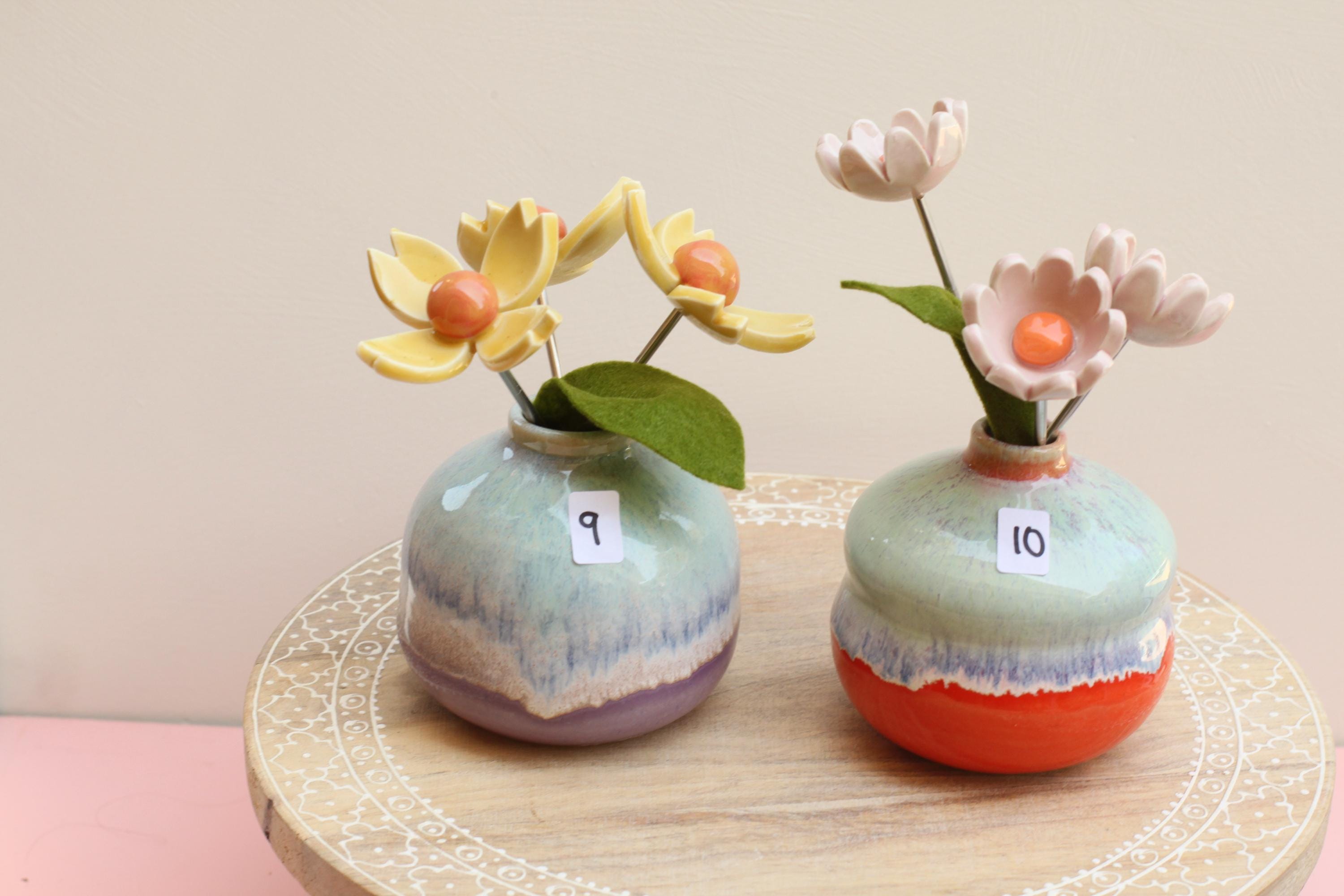 Listing is for one colorful vase with handmade porcelain flowers 2 or 3 on aluminum wire and a felt leaf. Choose your favorite, these are already paired and wires cut to fit the vase. No substitutions on flowers.