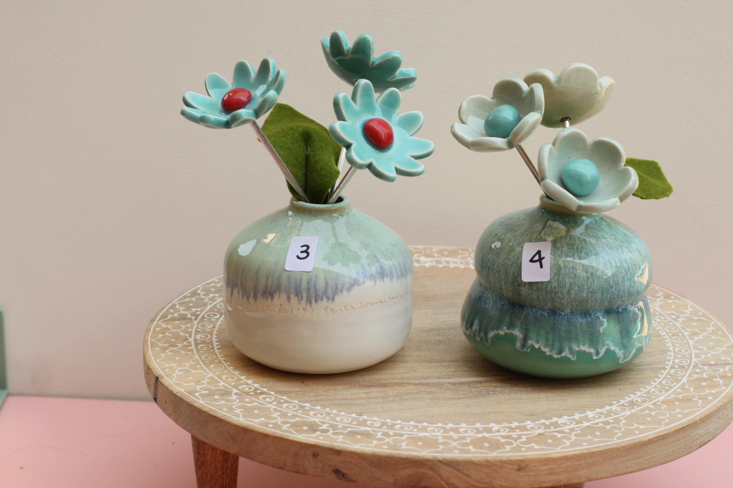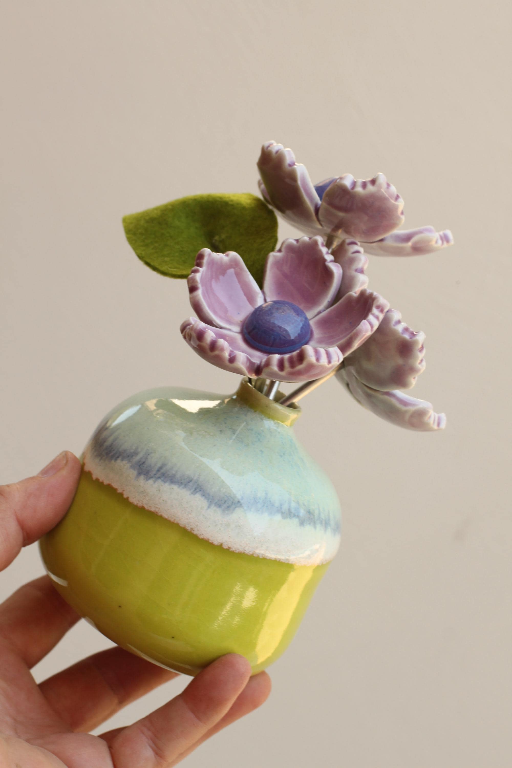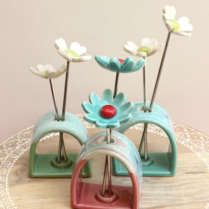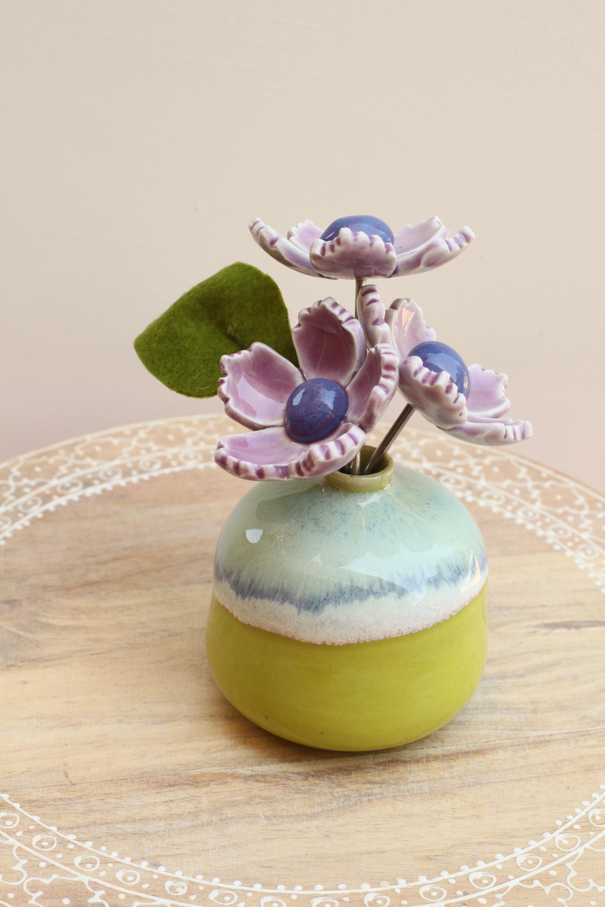 Listing is for one colorful vase with handmade porcelain flowers 2 or 3 on aluminum wire and a felt leaf. Choose your favorite, these are already paired and wires cut to fit the vase. No substitutions on flowers.