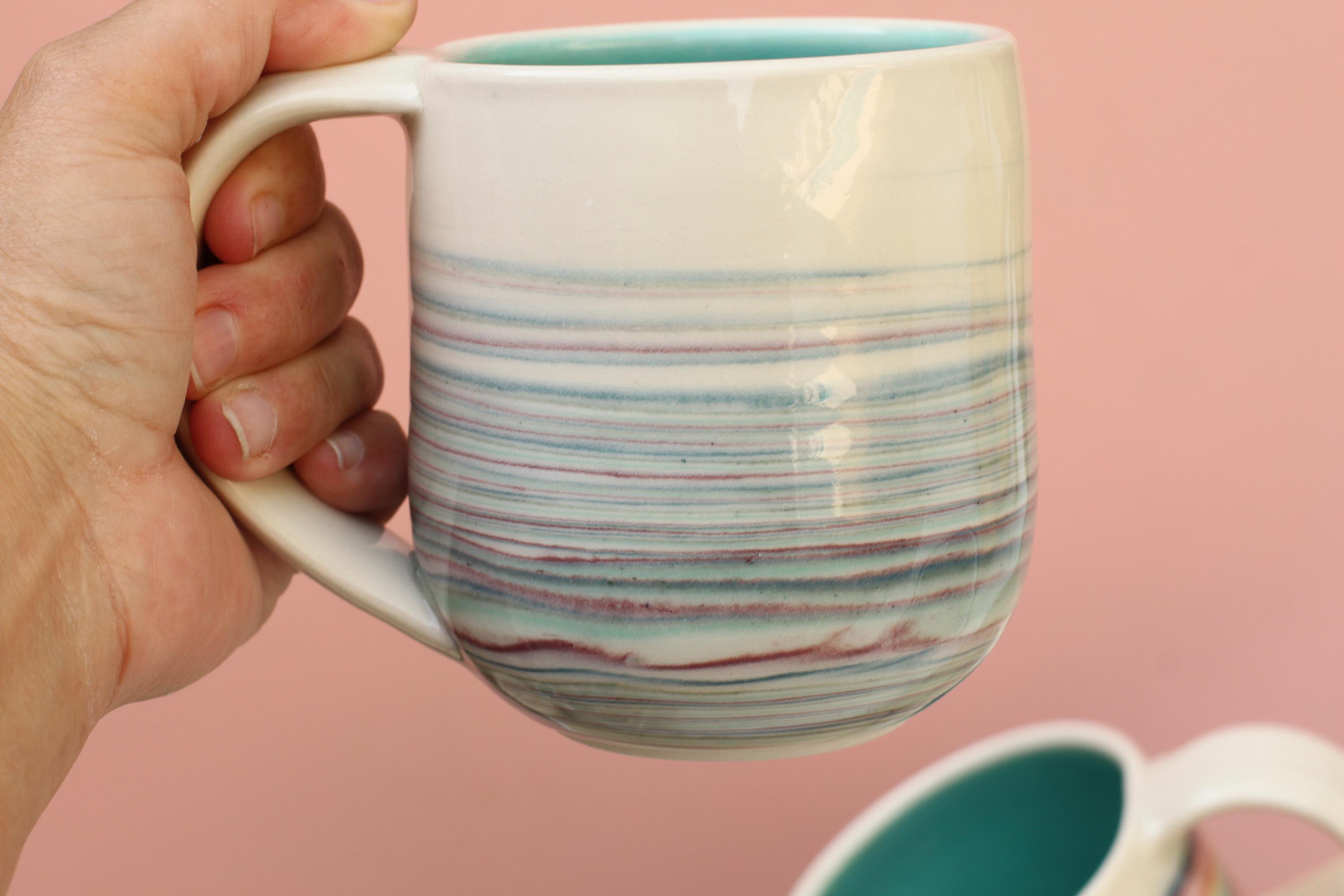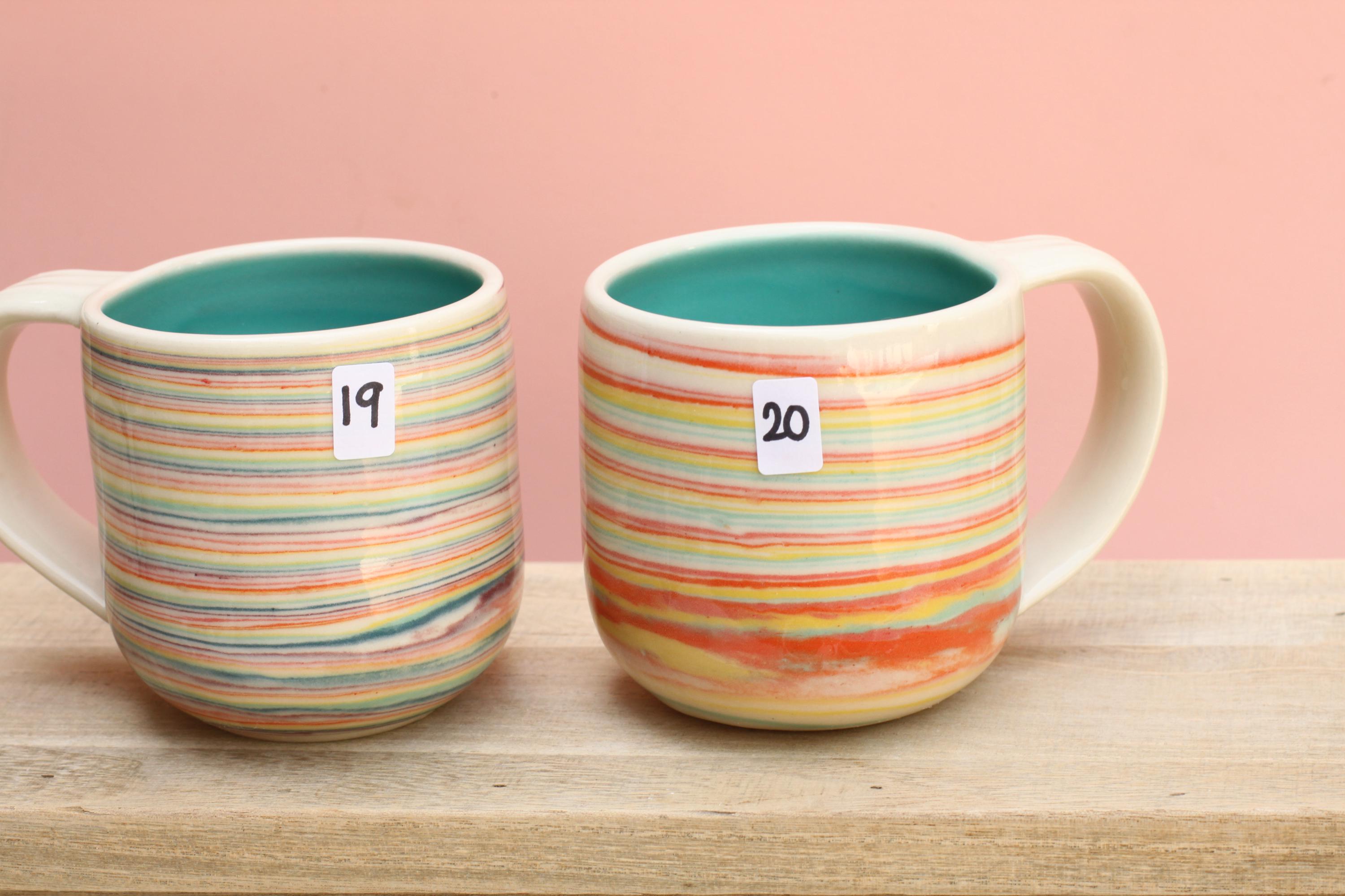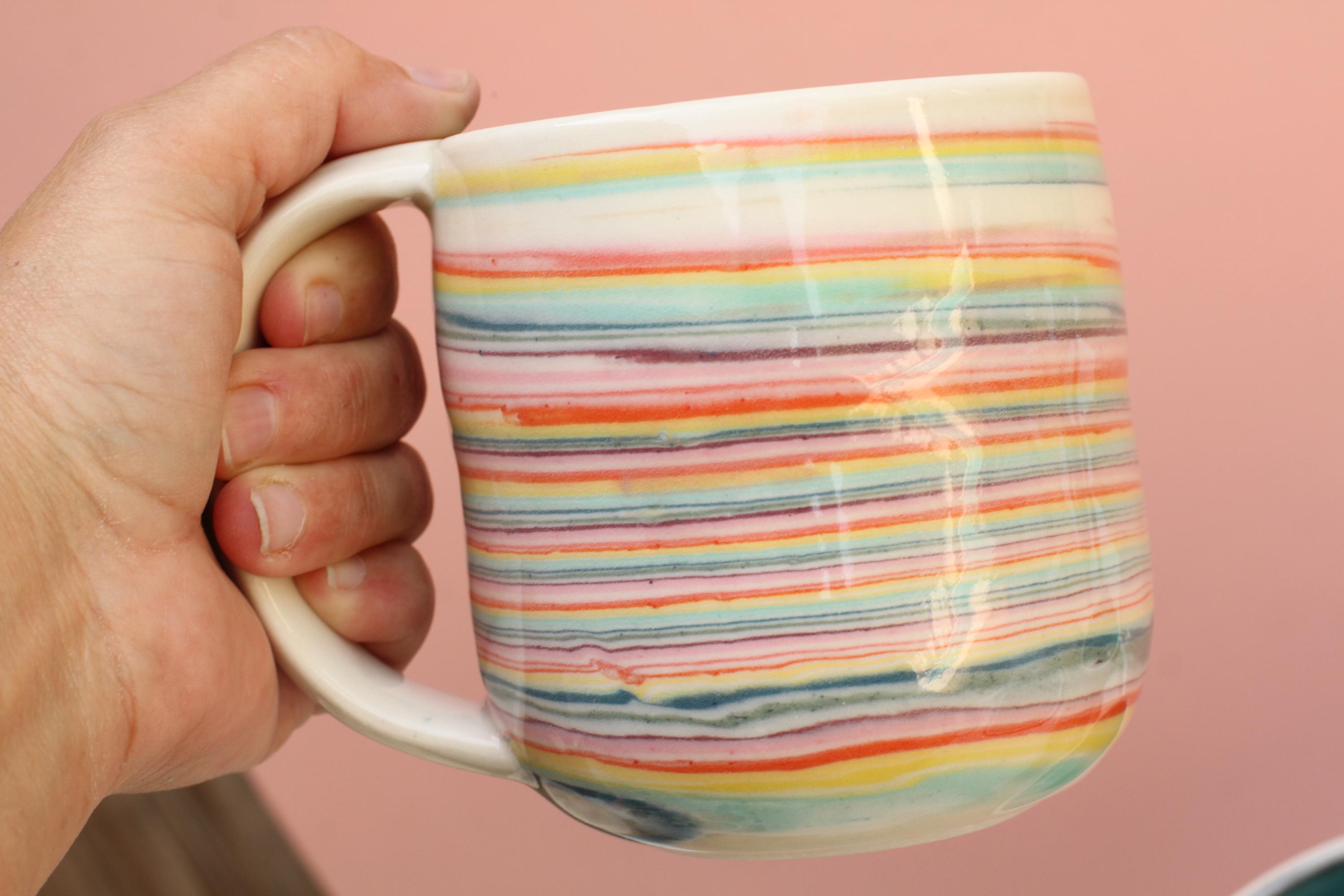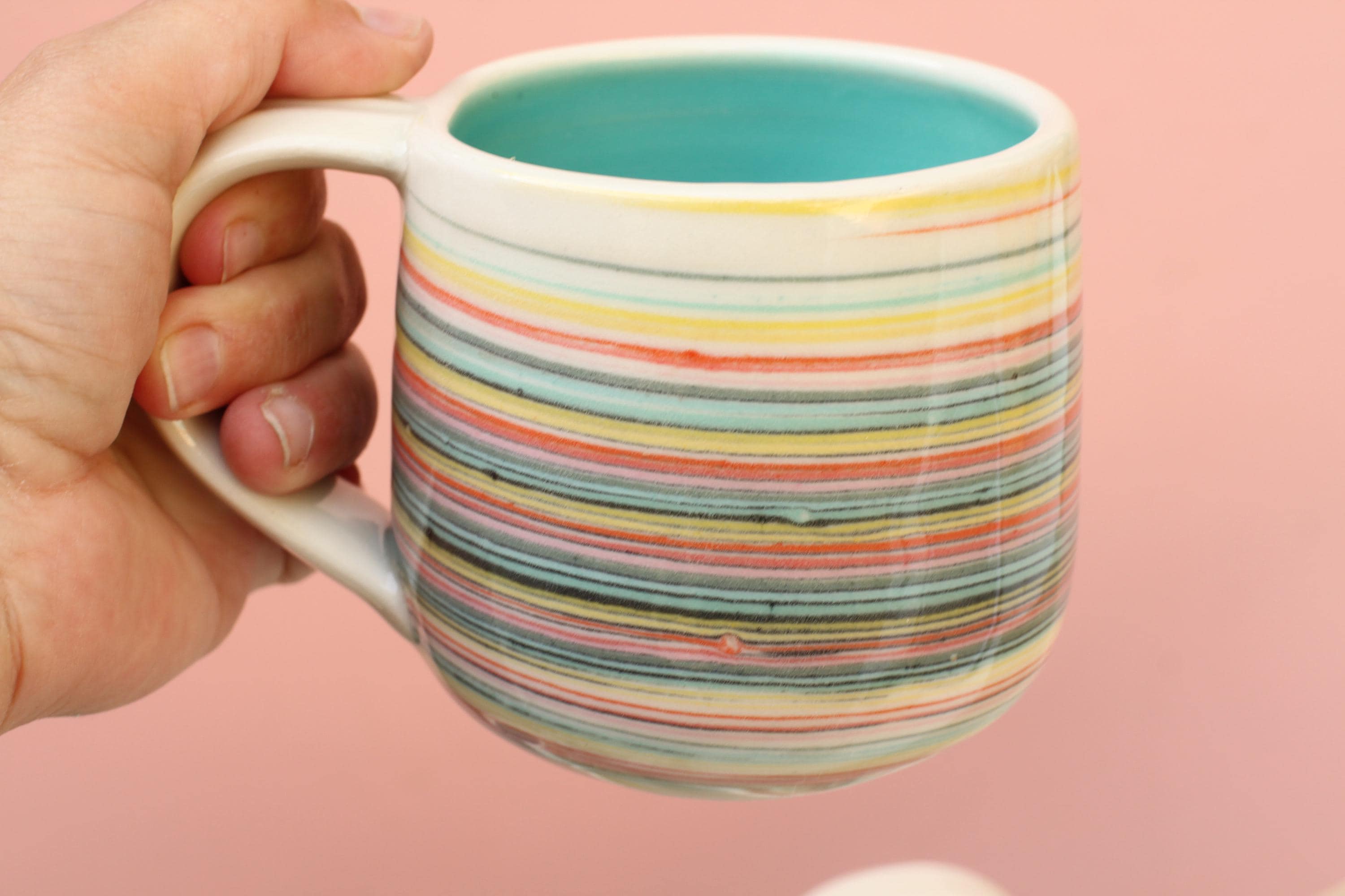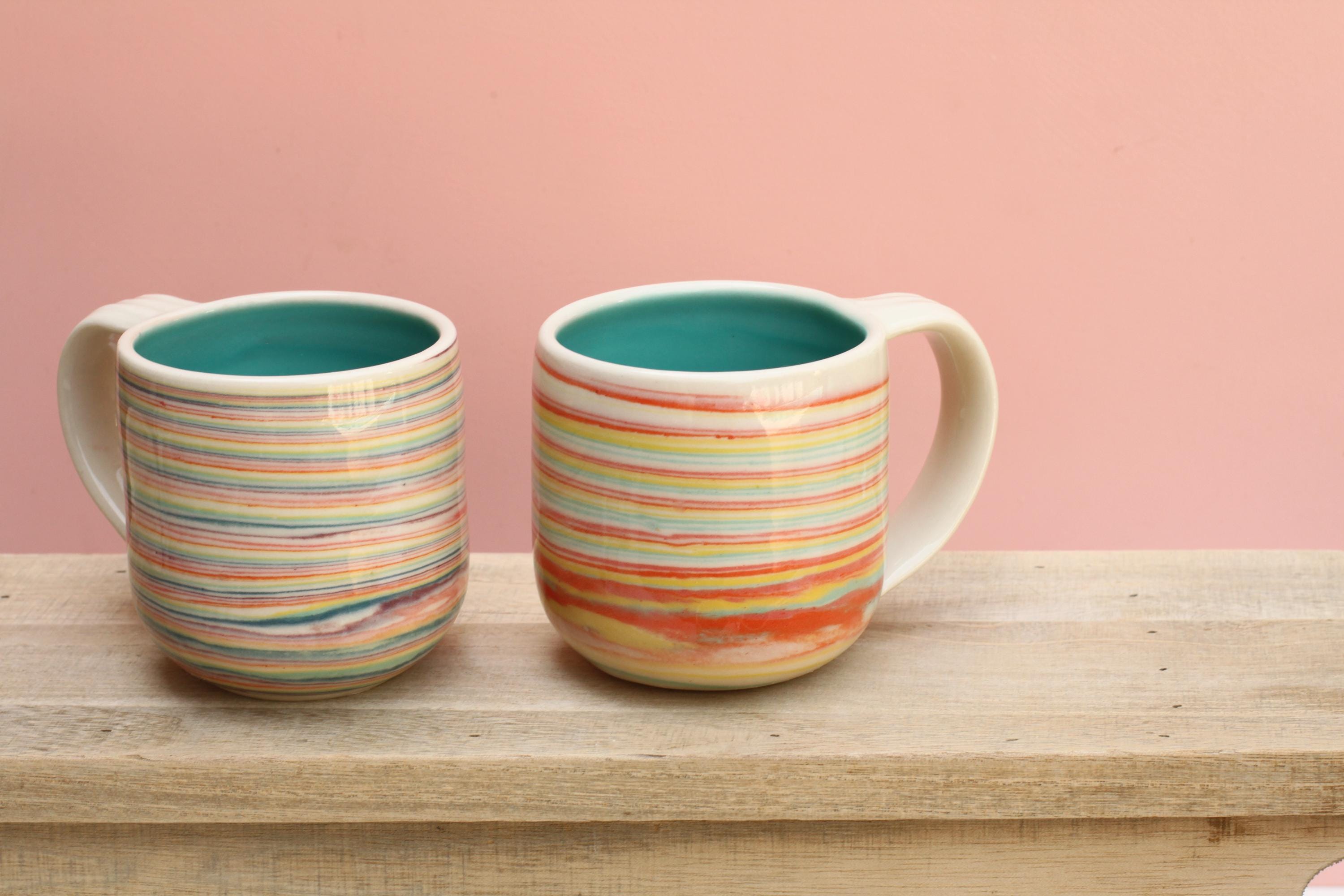 This listing is for one mug, choose your favorite. To make this vase, I first made several different colors of porcelain by mixing in mason stains to my white porcelain clay and wedging forever to completely incorporate the stains.