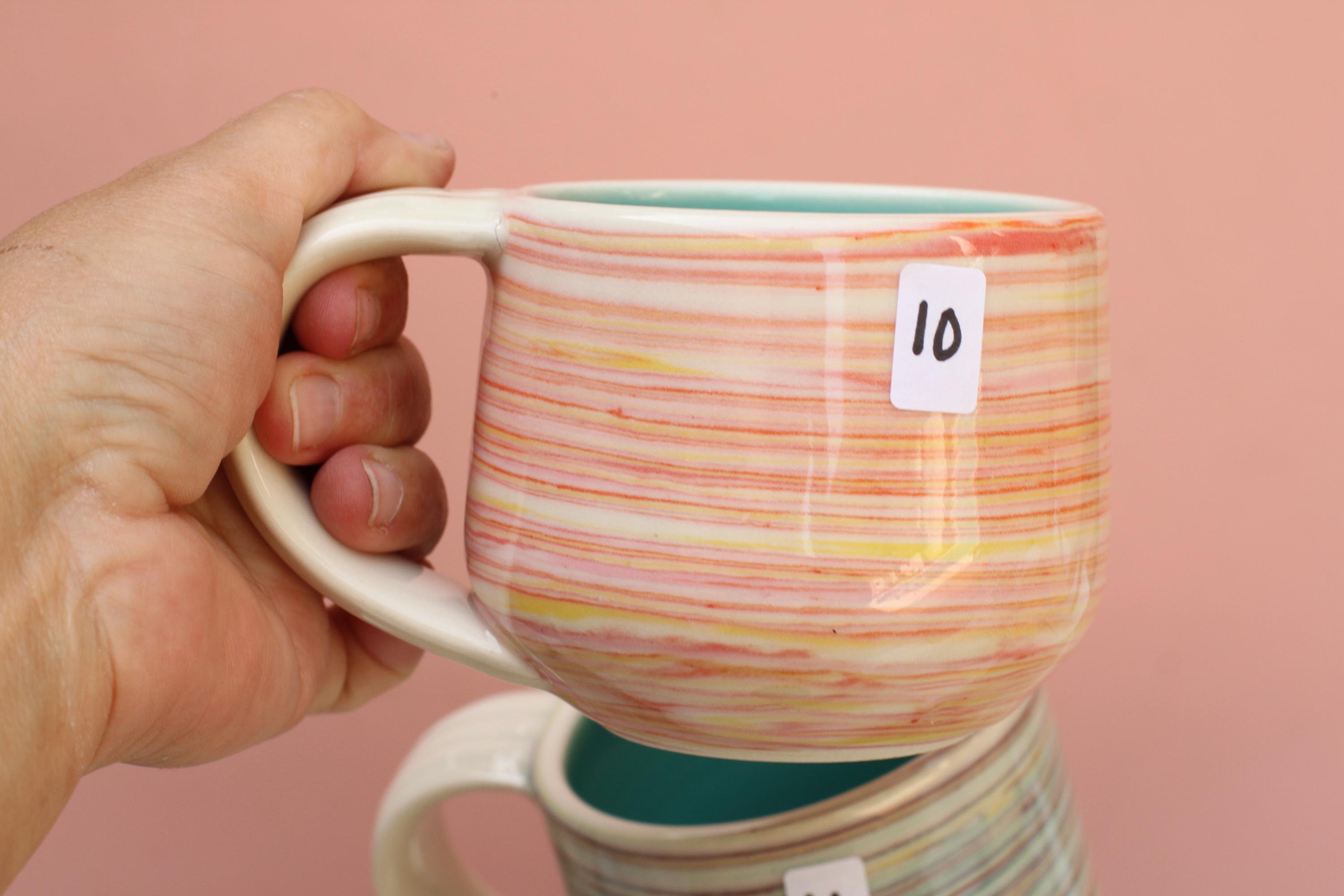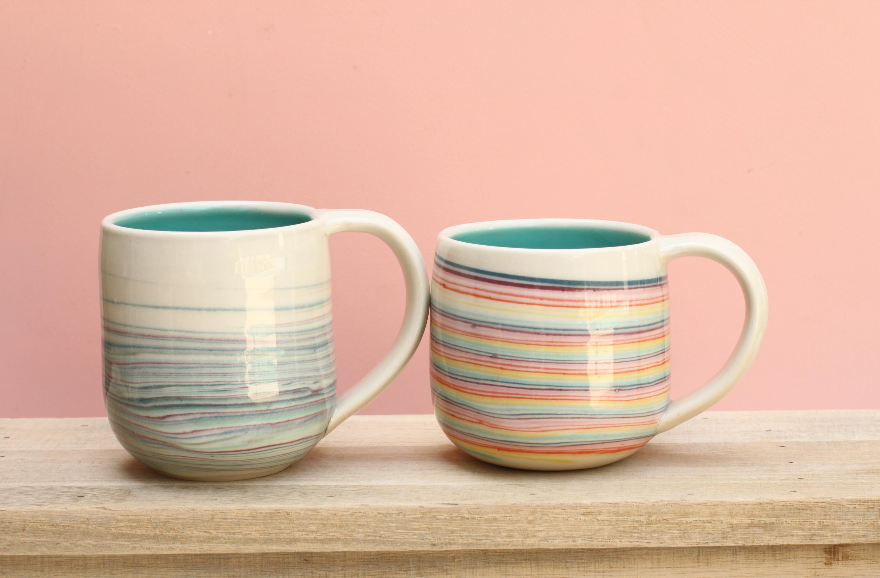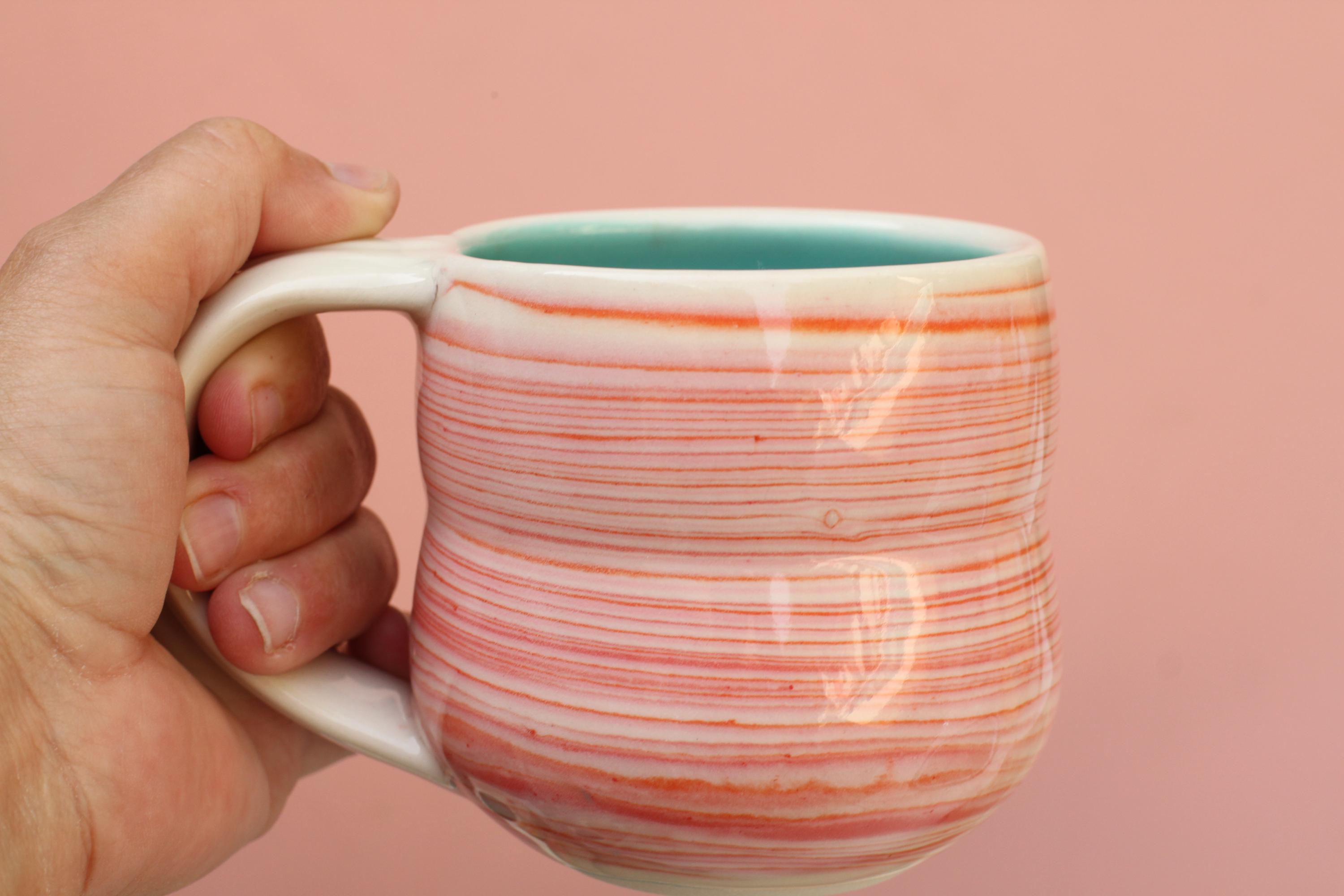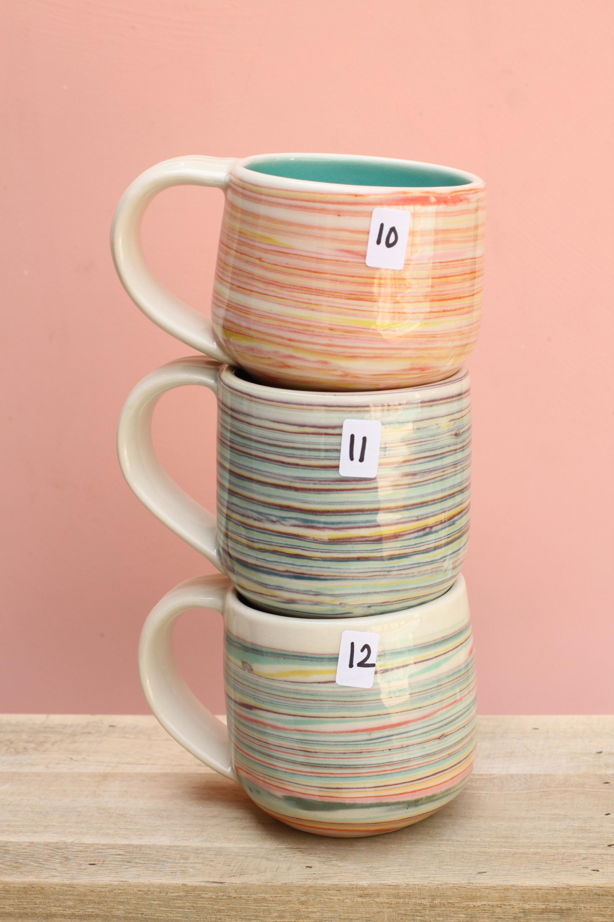 This listing is for one mug, choose your favorite. To make this vase, I first made several different colors of porcelain by mixing in mason stains to my white porcelain clay and wedging forever to completely incorporate the stains.