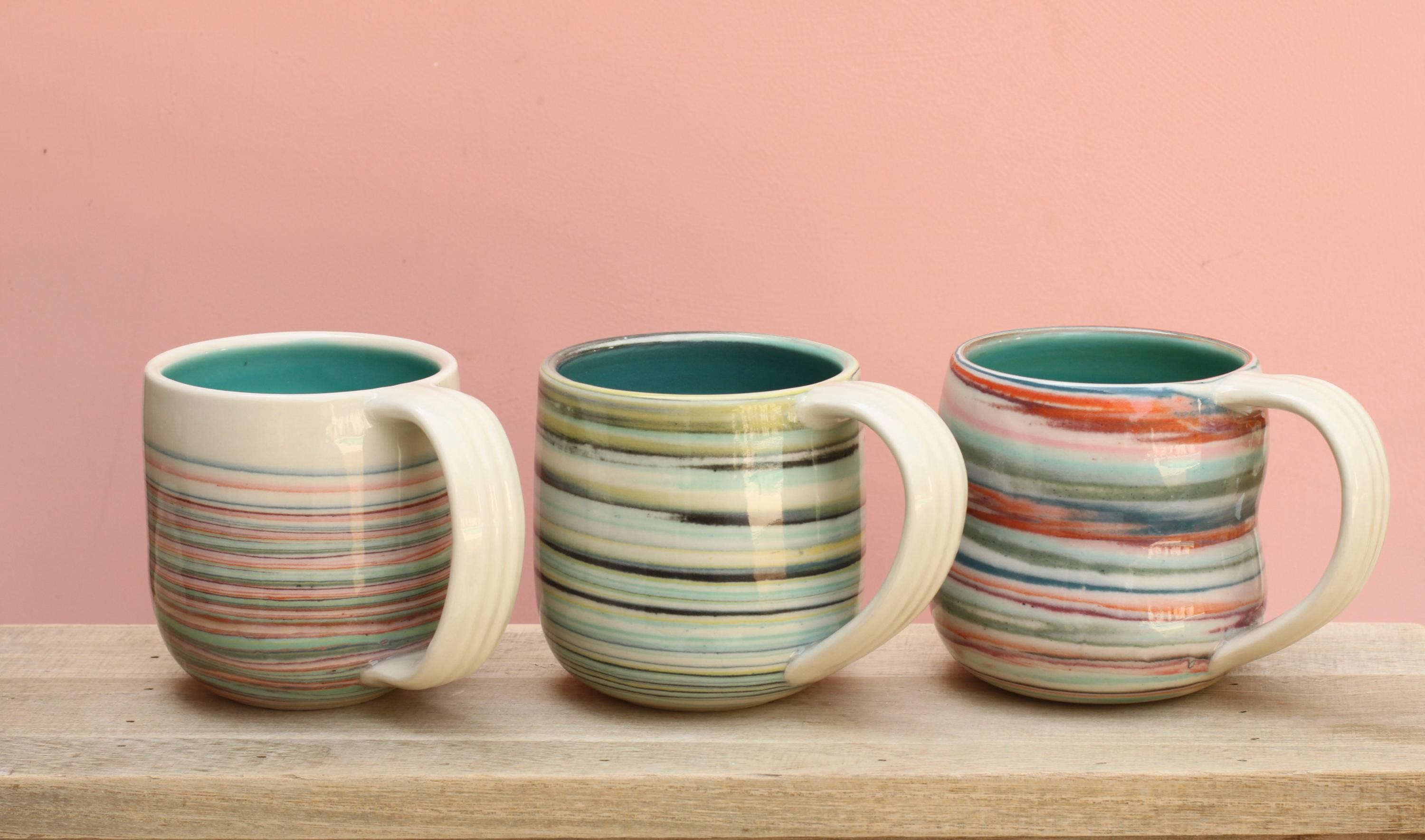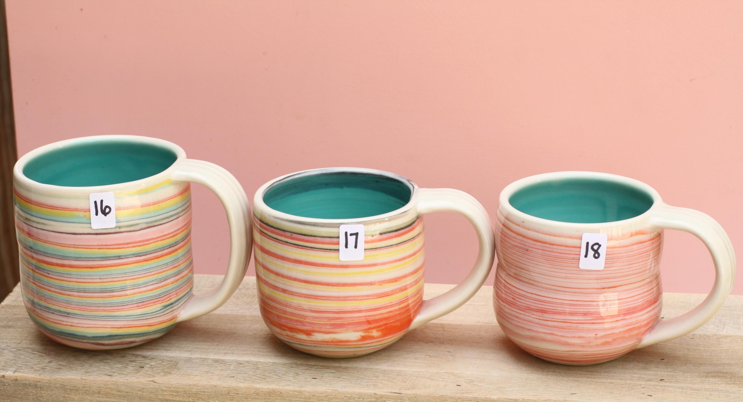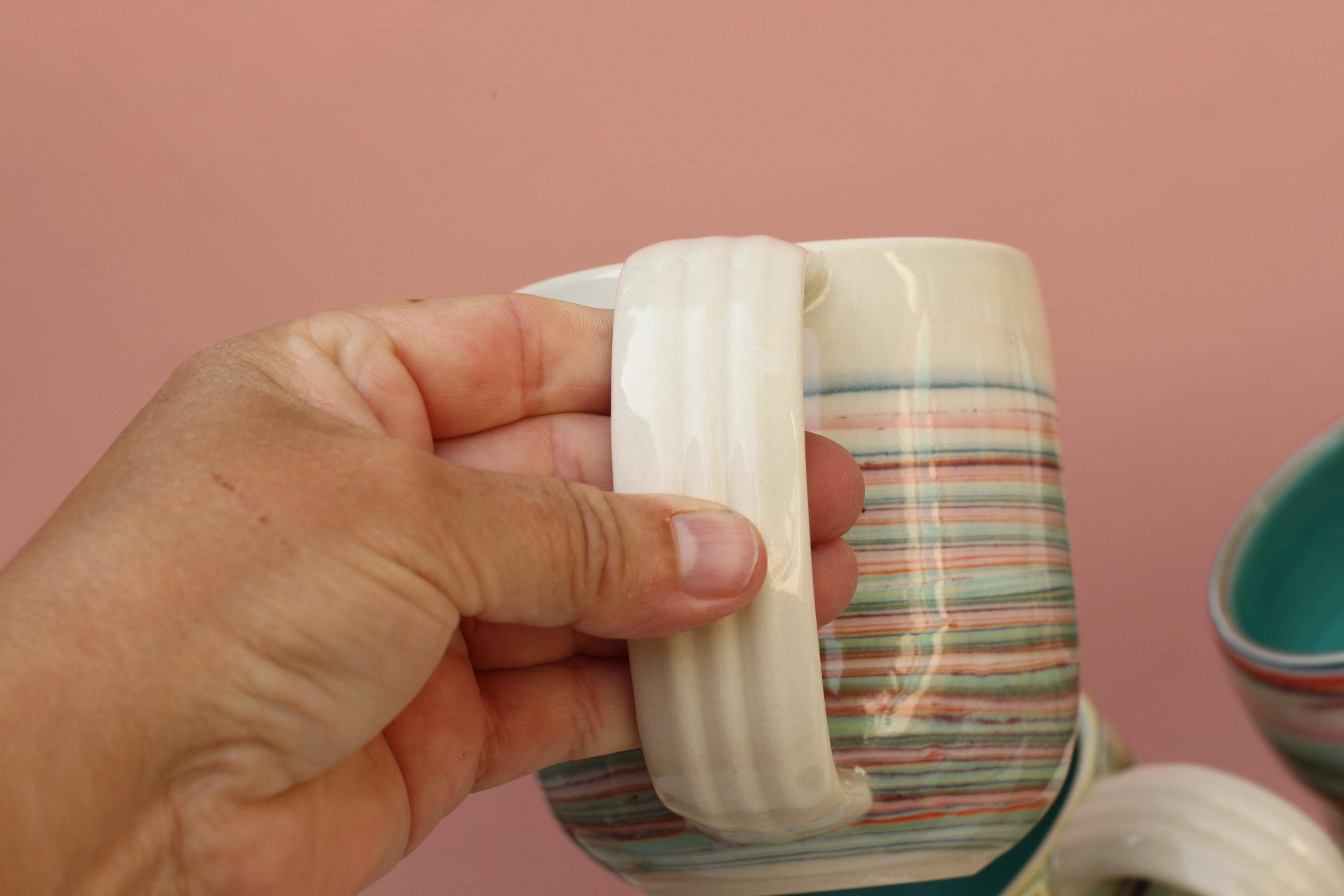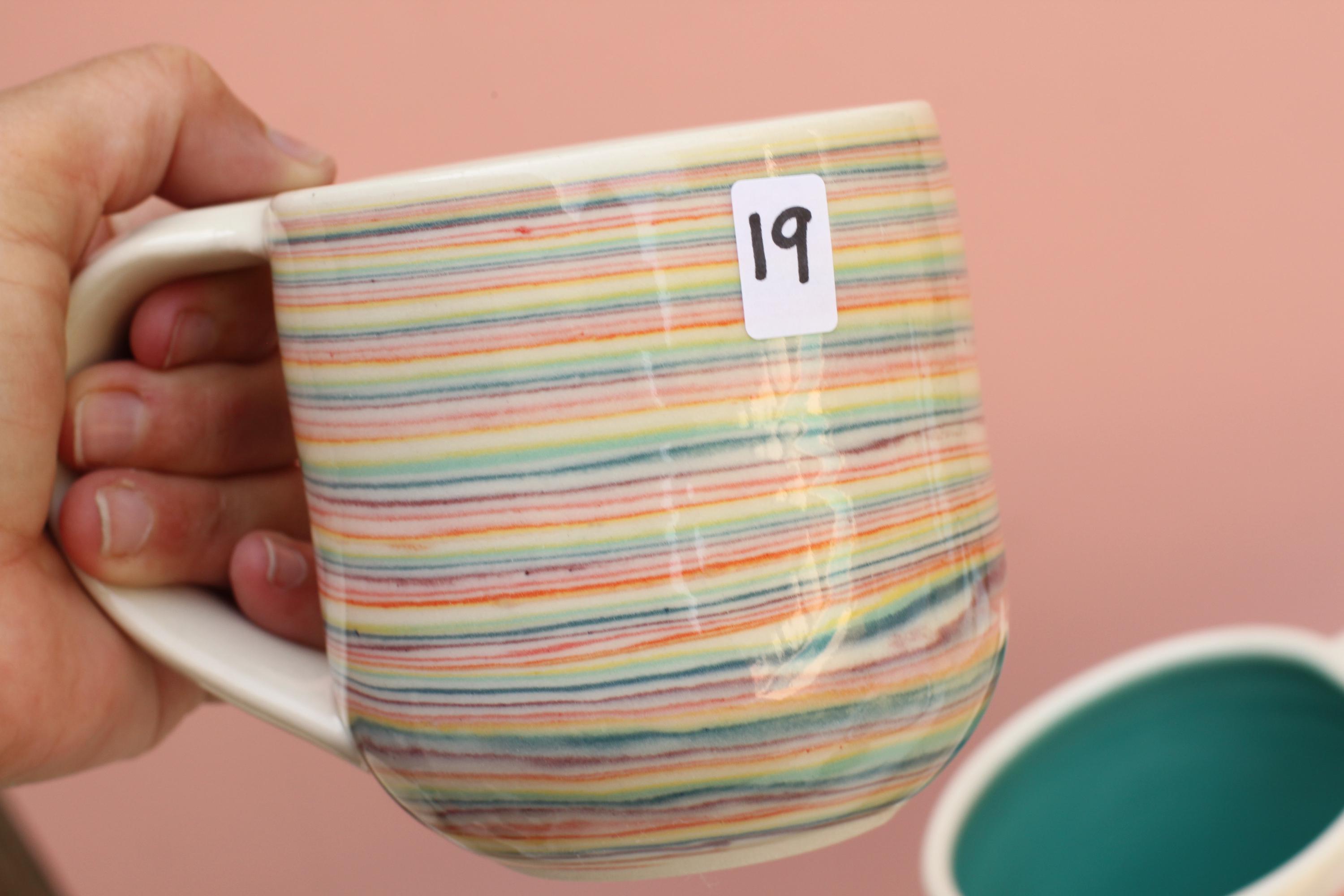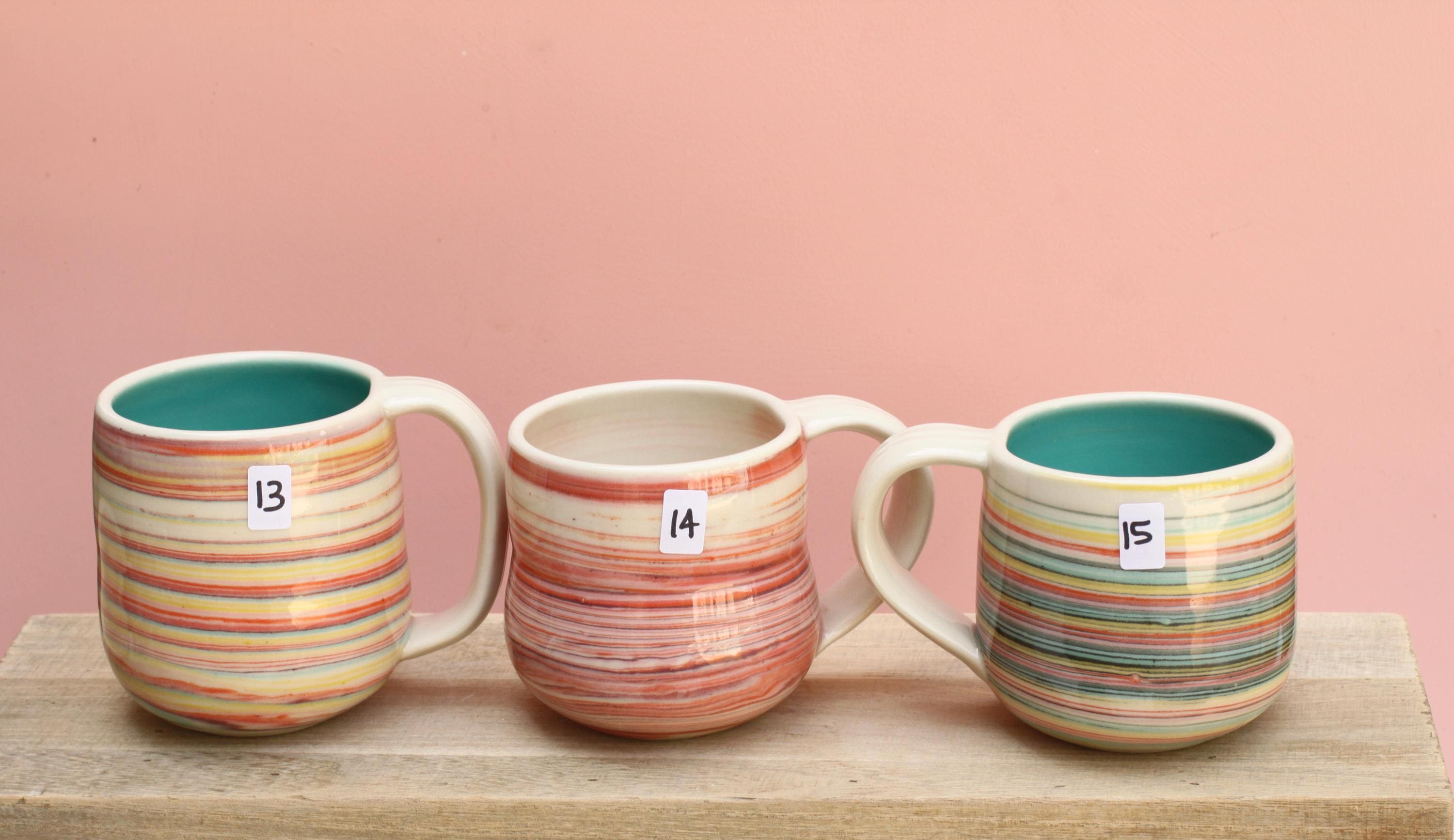 This listing is for one mug, choose your favorite. To make this vase, I first made several different colors of porcelain by mixing in mason stains to my white porcelain clay and wedging forever to completely incorporate the stains.