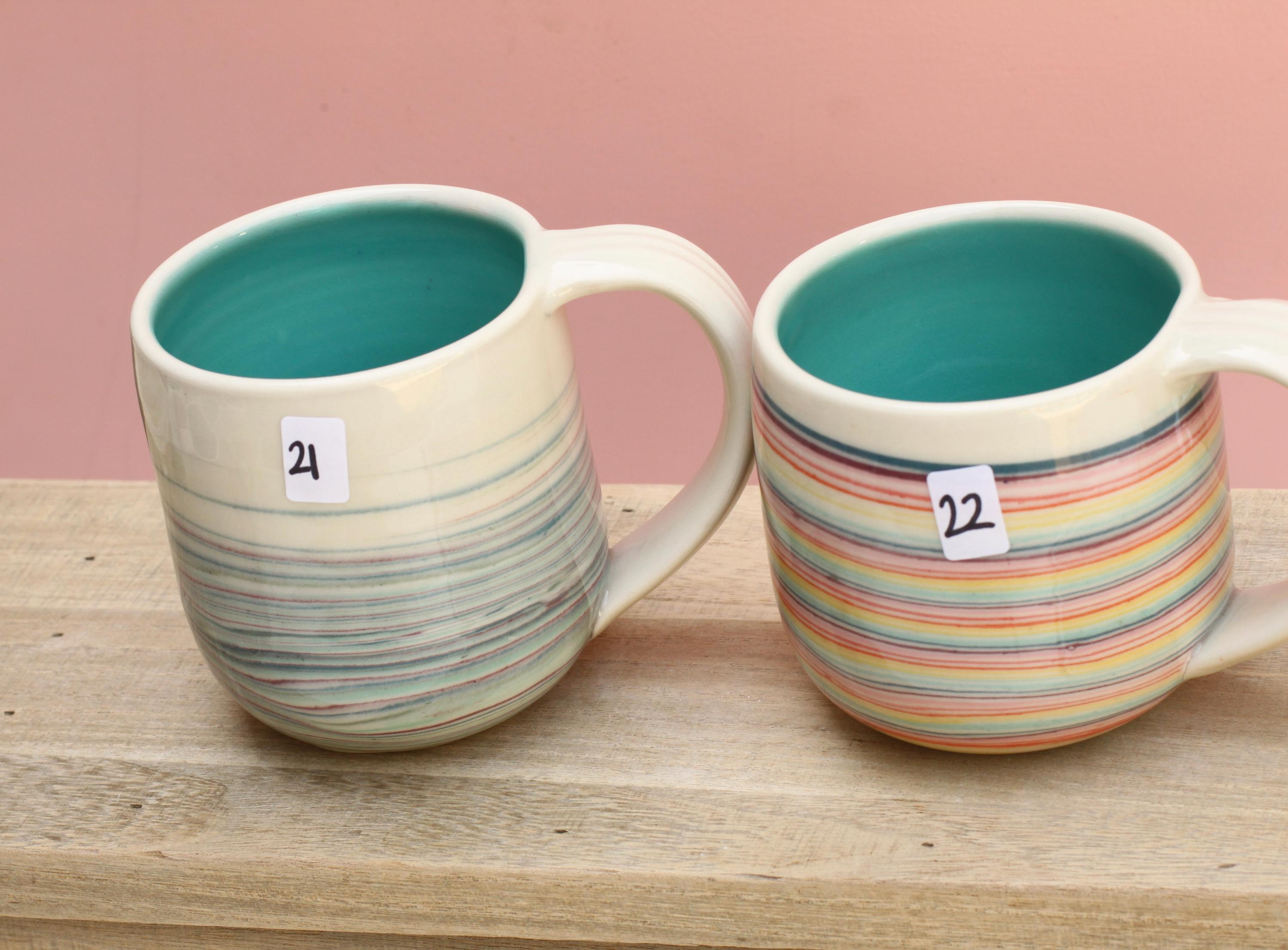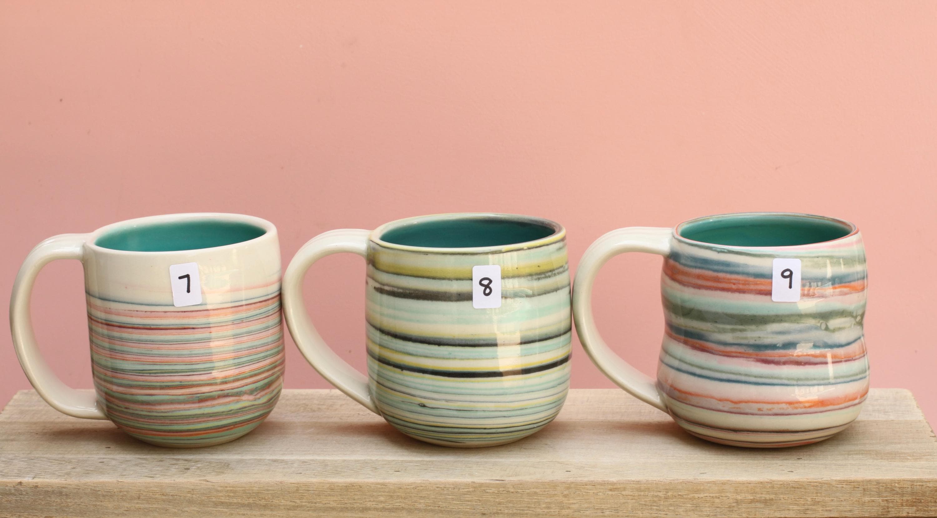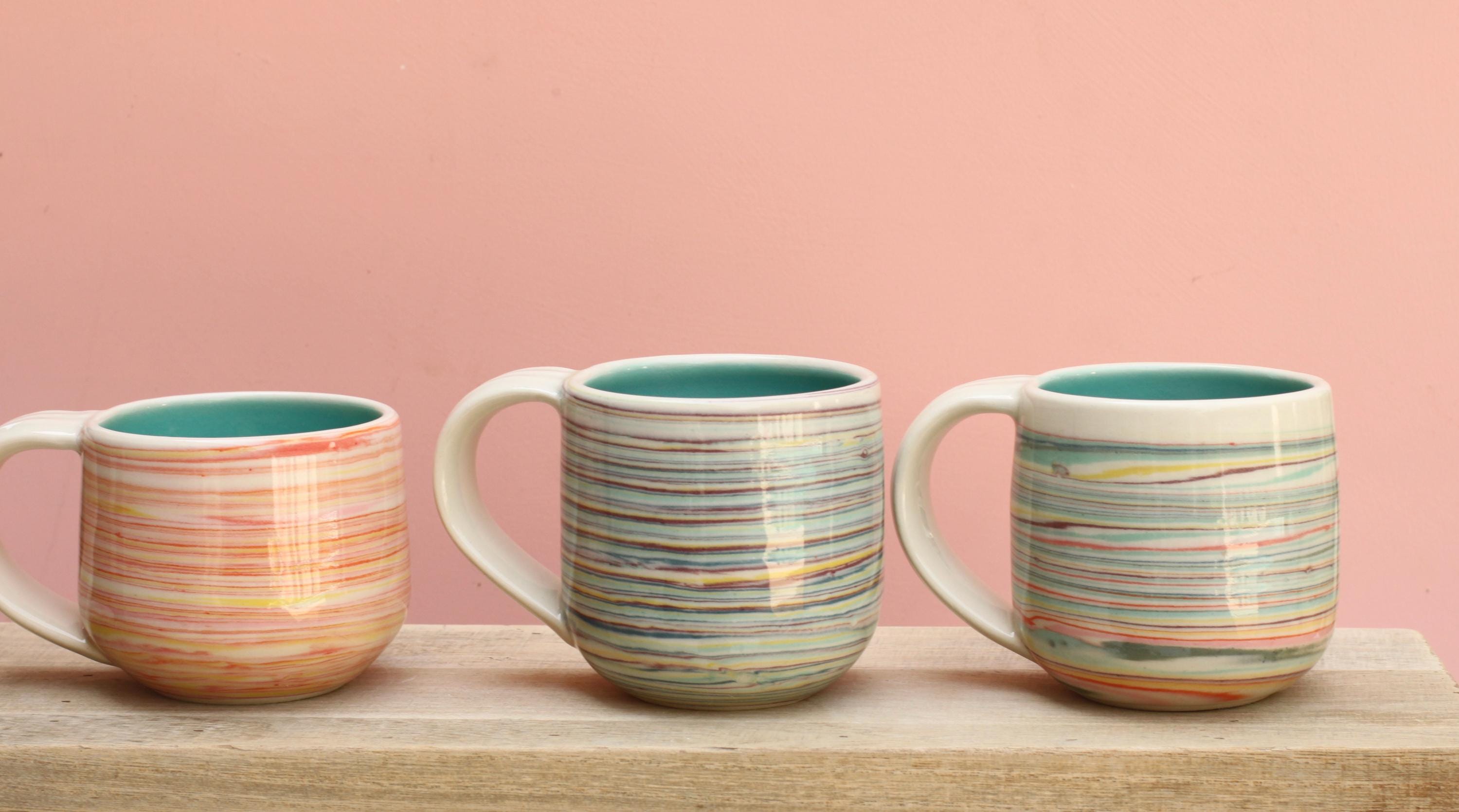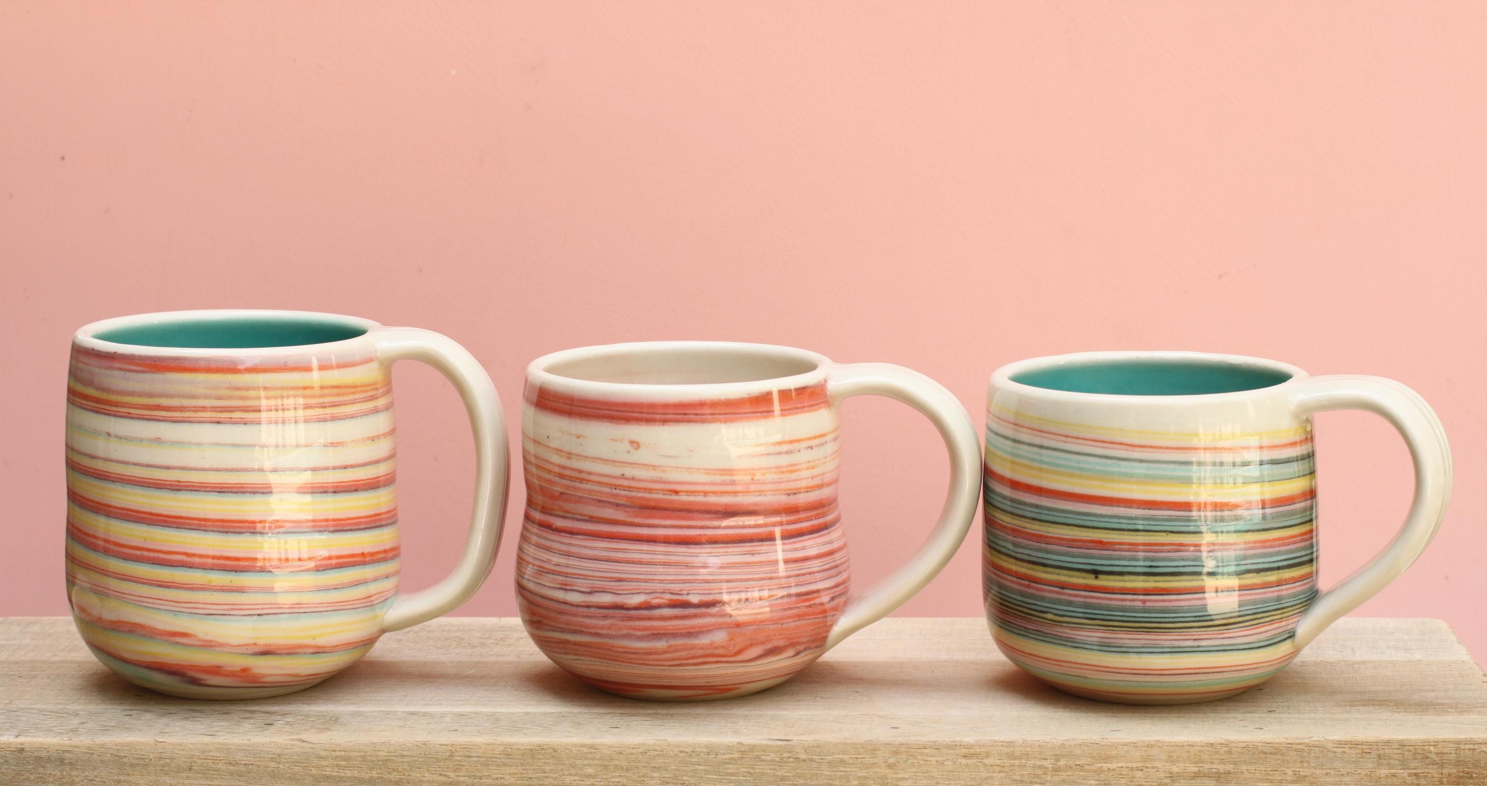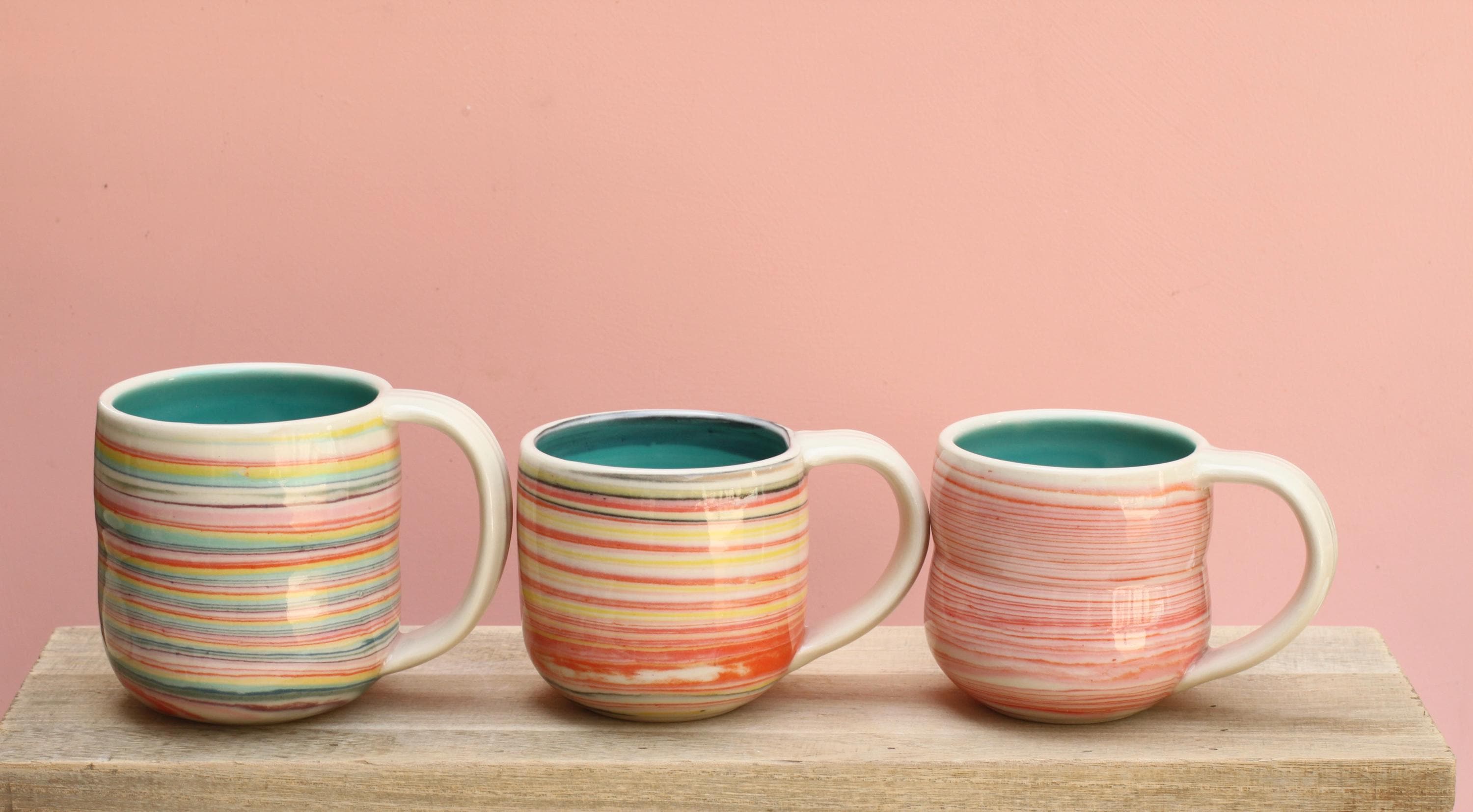 This listing is for one mug, choose your favorite. To make this vase, I first made several different colors of porcelain by mixing in mason stains to my white porcelain clay and wedging forever to completely incorporate the stains.