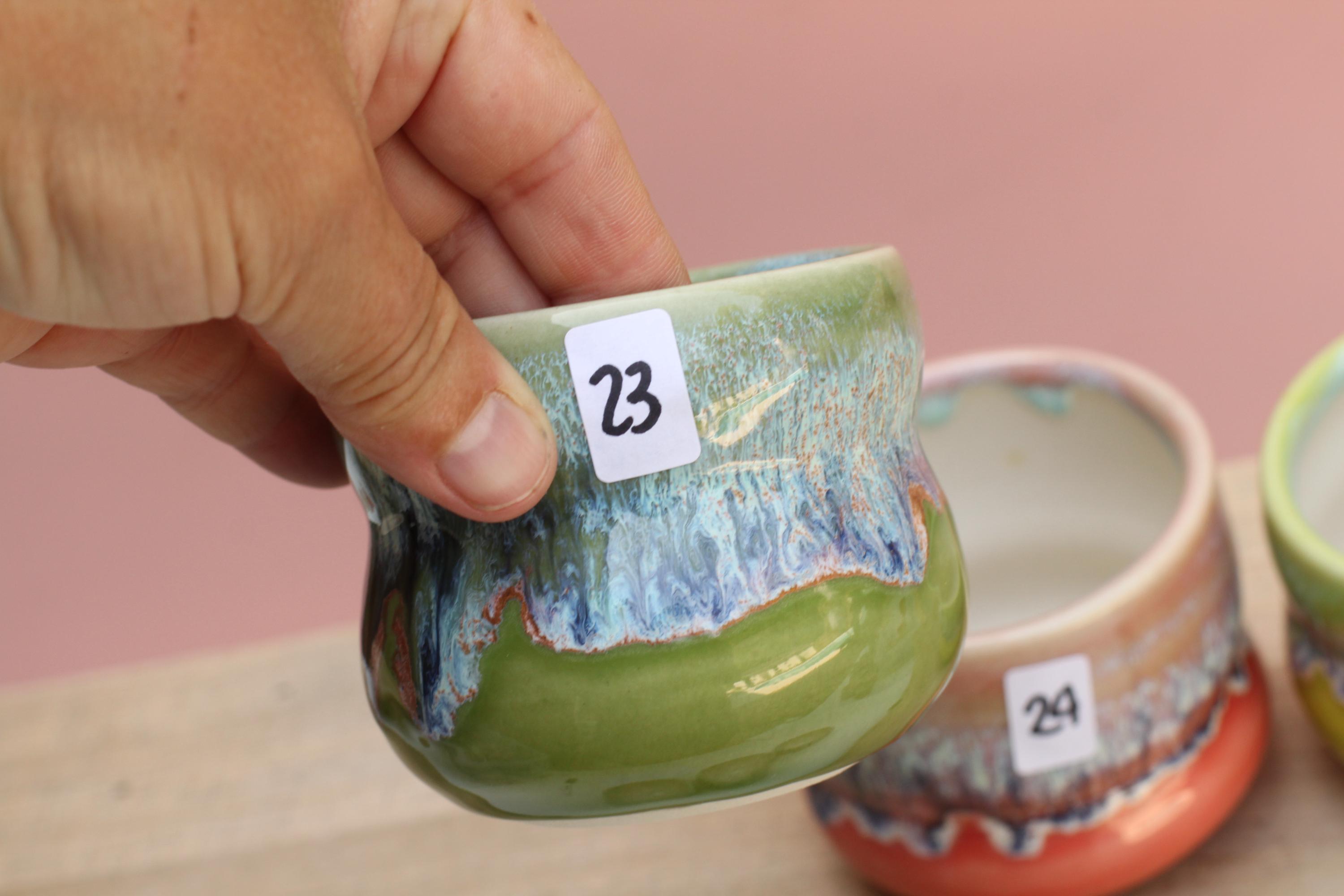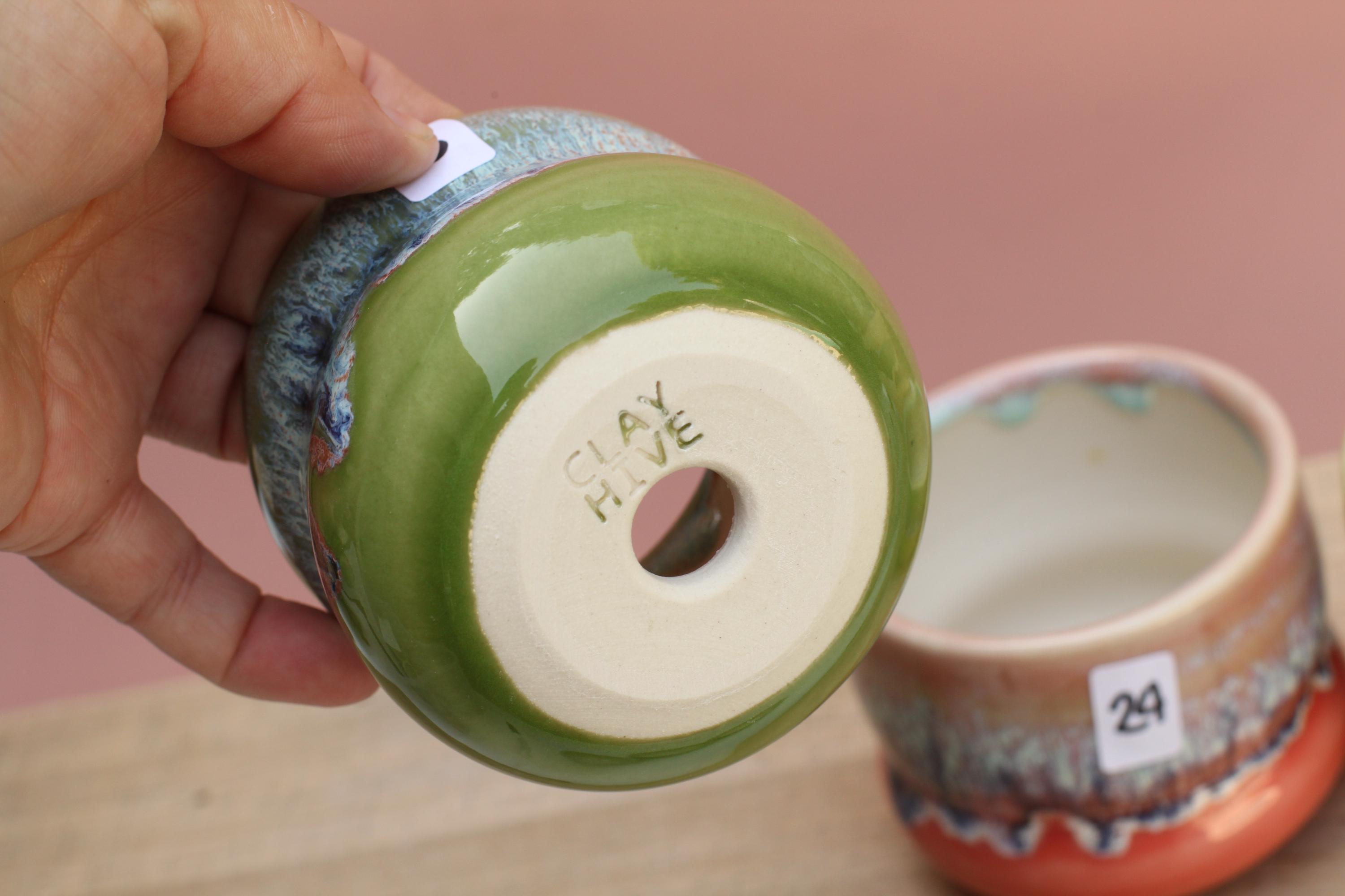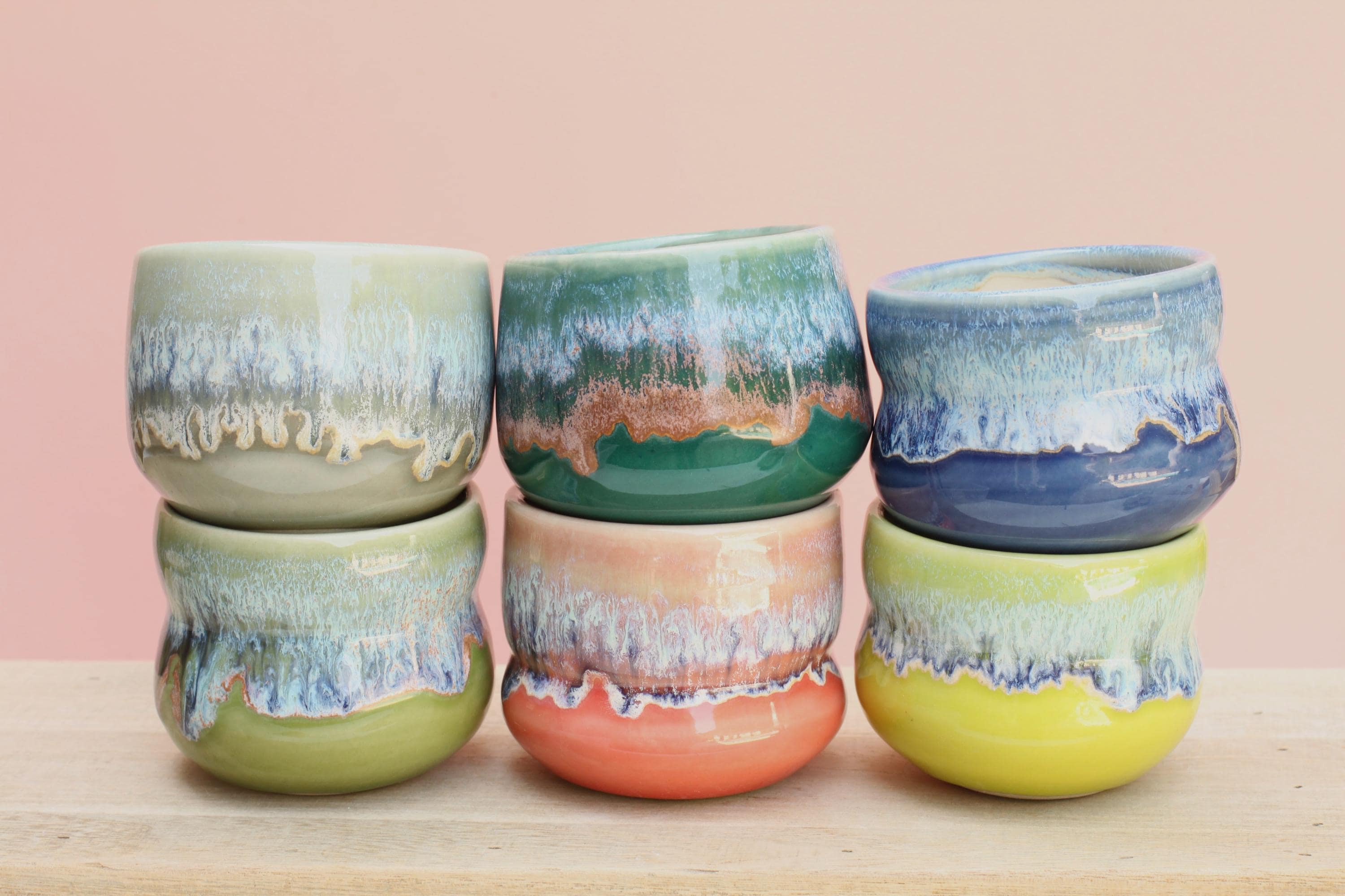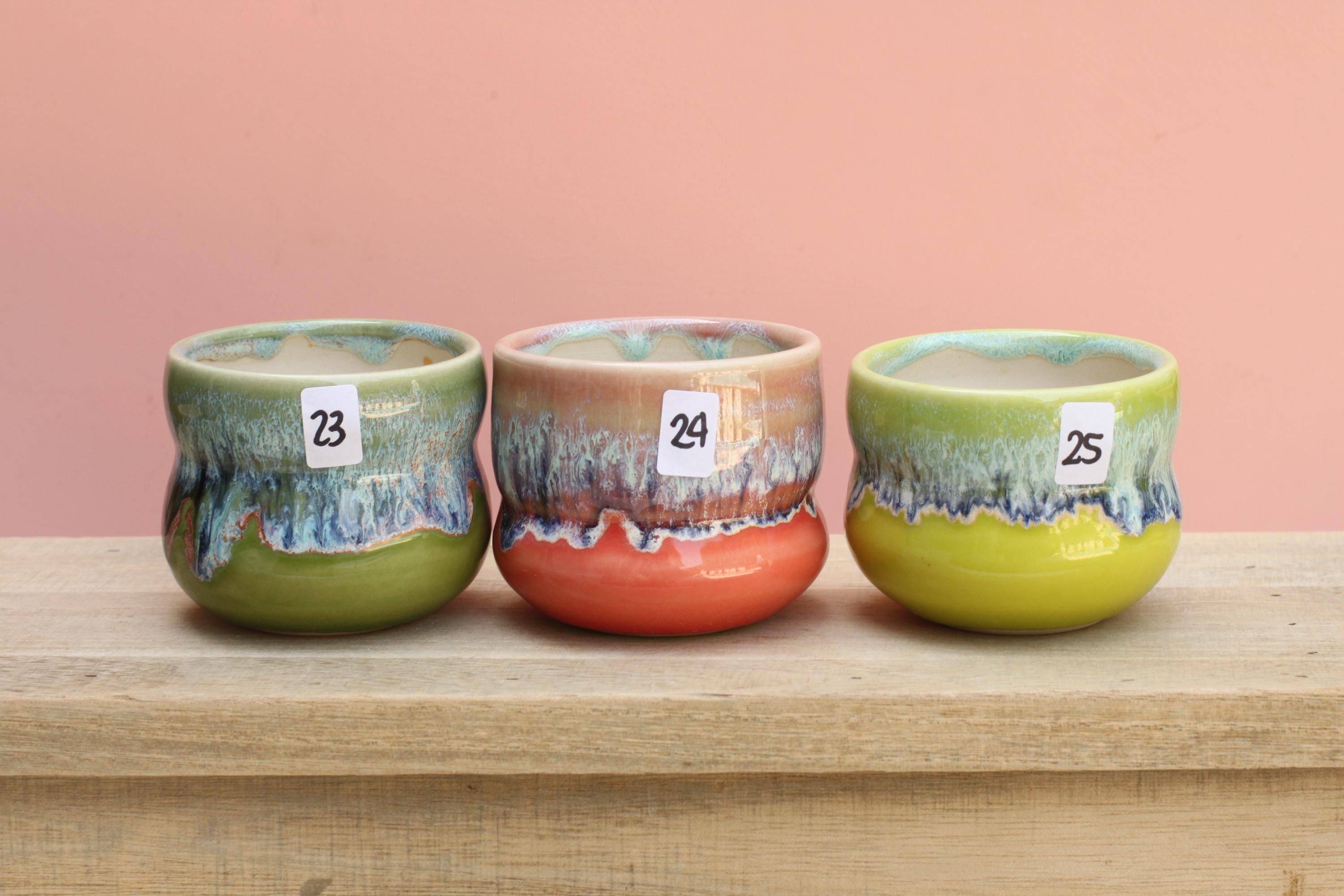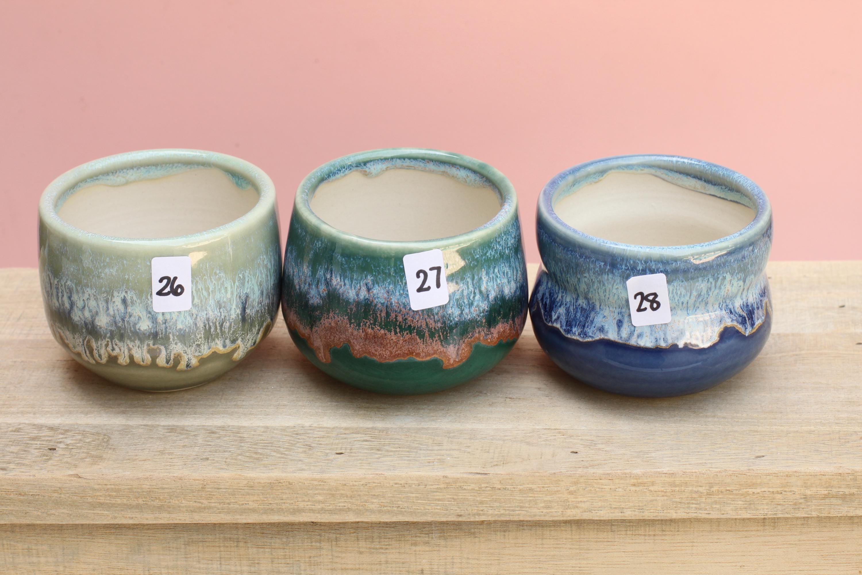 This little planter is wheel thrown from porcelain, add a succulent and you have a great gift for the person who's got everything:) Layers of reactive glaze create the vivid colors and hole have been added for drainage. This does NOT come with a saucer. It can be used indoors and outdoors and dishwasher safe. Pick your favorite from the drop-down menu, the listing is for one planter.
