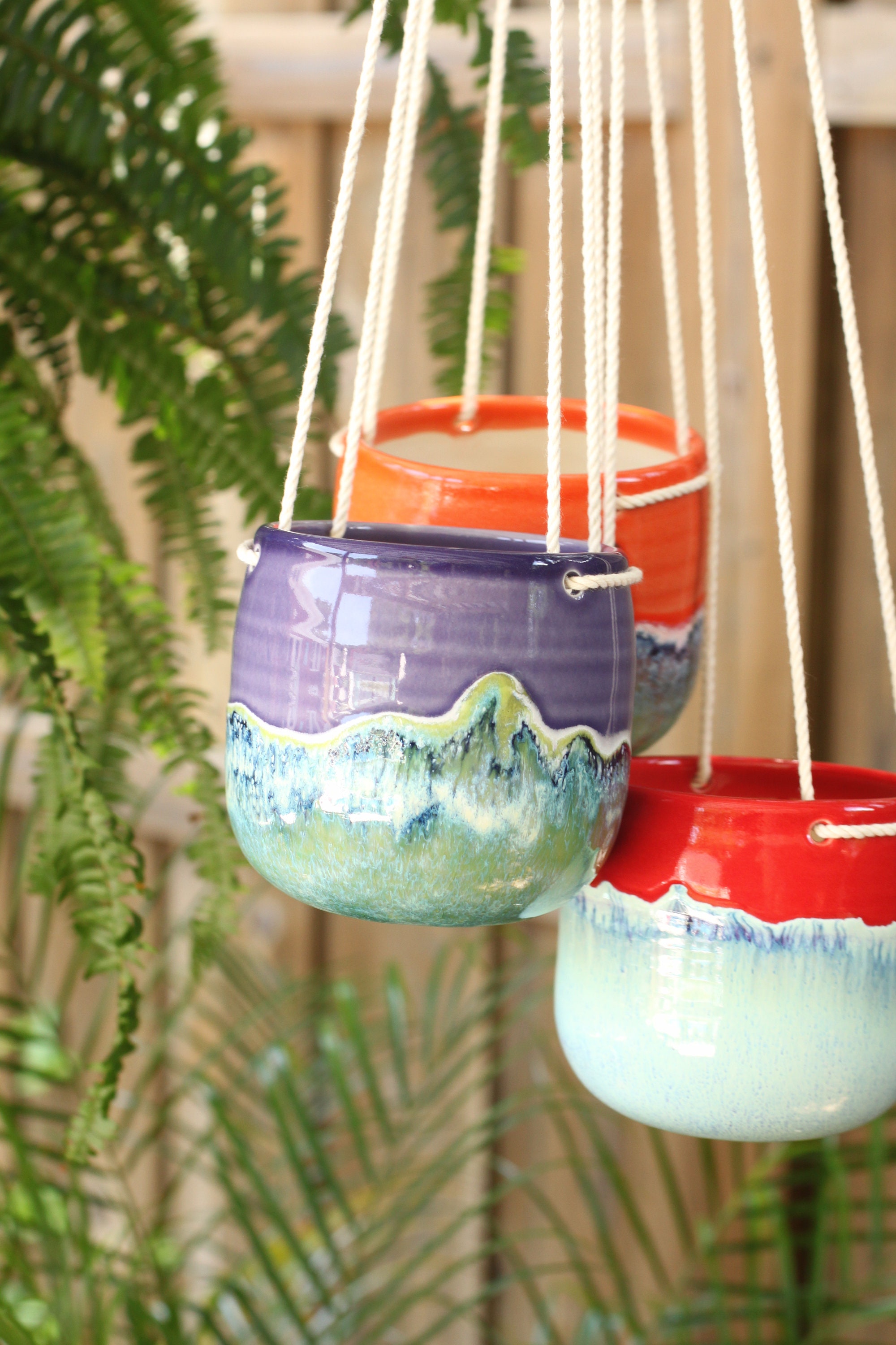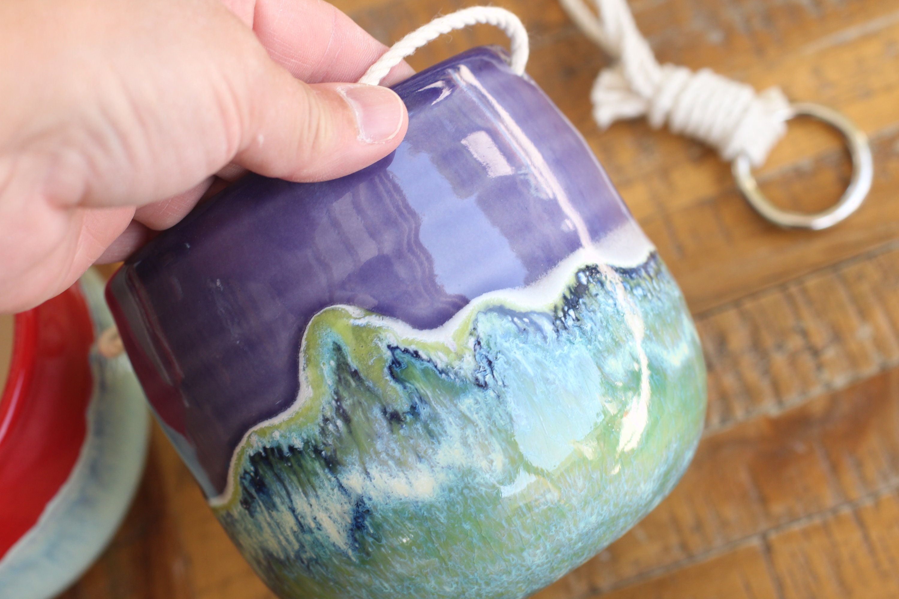 This little hanging pot is just precious. So well made and one-of-a-kind. Love the red/blue glaze. I'll definitely be ordering more in the future.