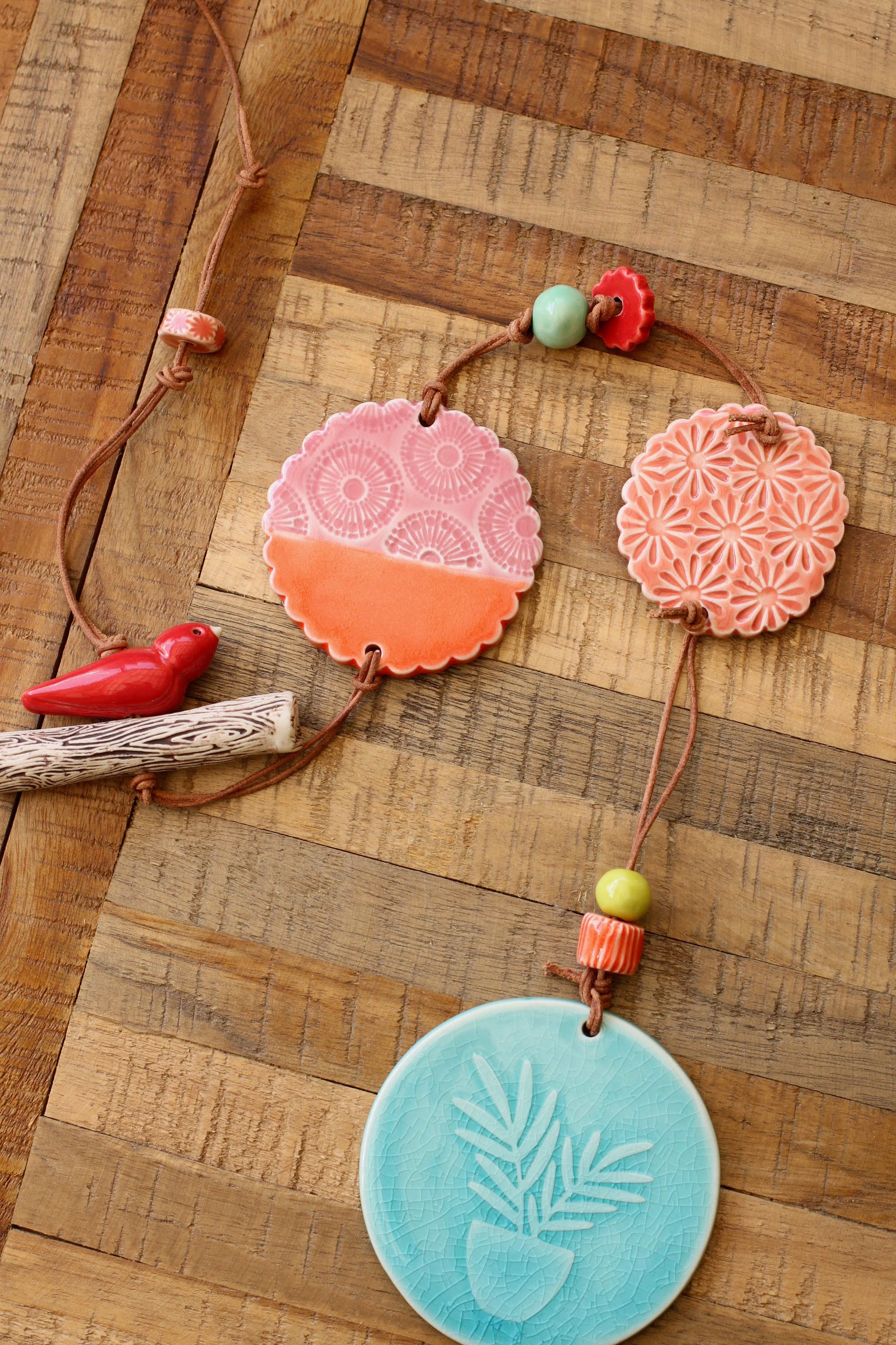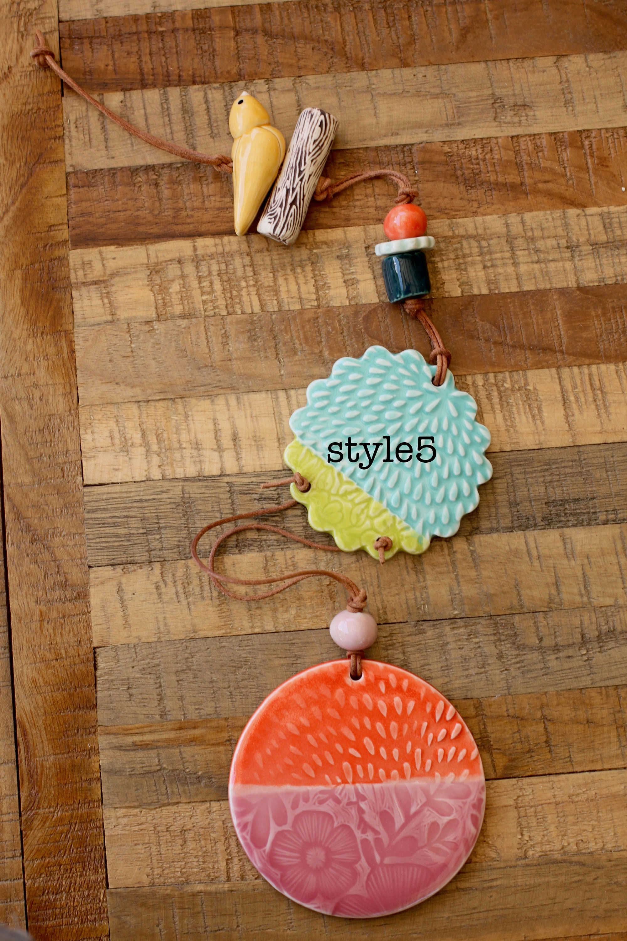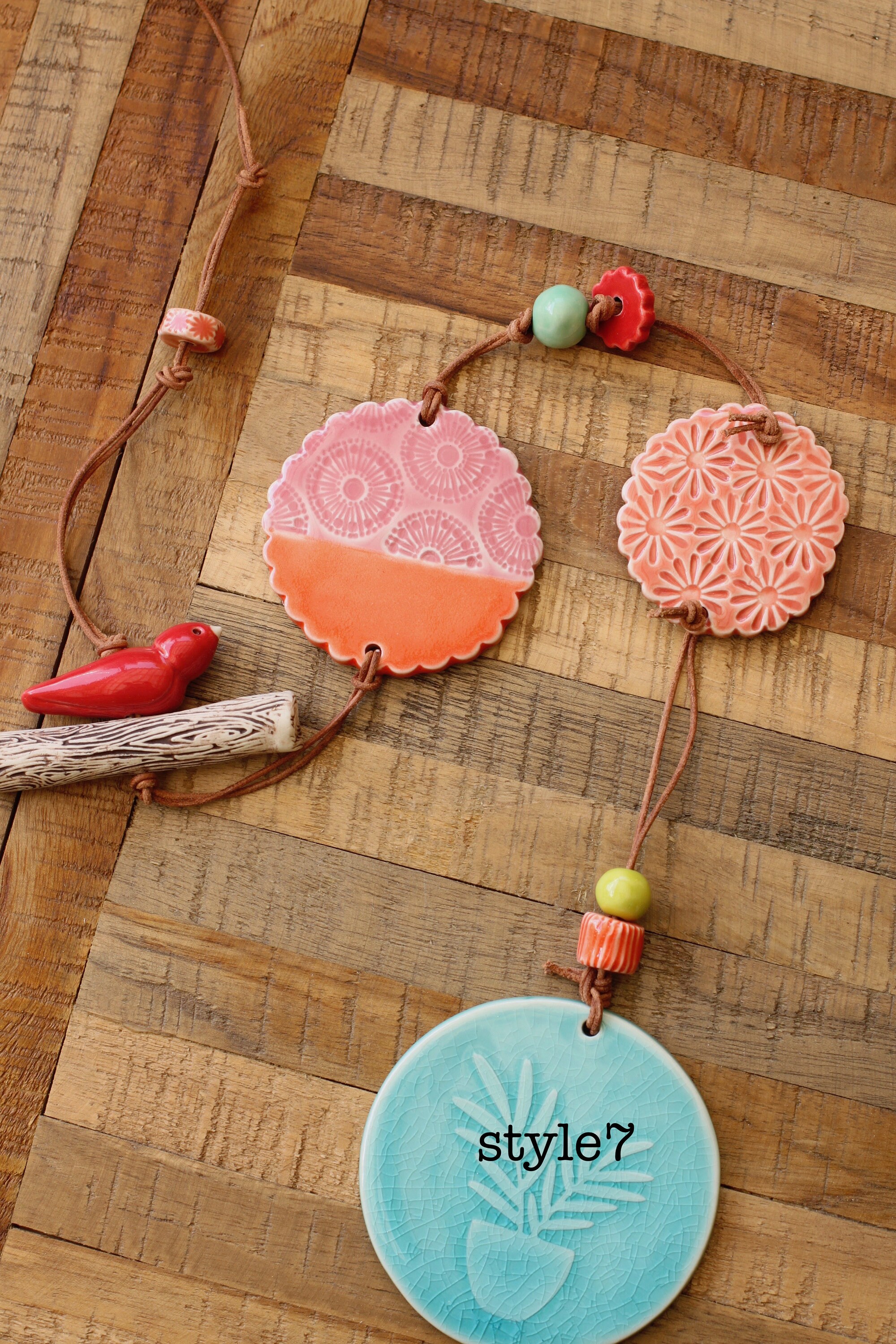 This sweet wall hanging is made from porcelain, the listing is for one hanging, choose your favorite. Each hanging is looped with leather and our handmade porcelain beads and components.
